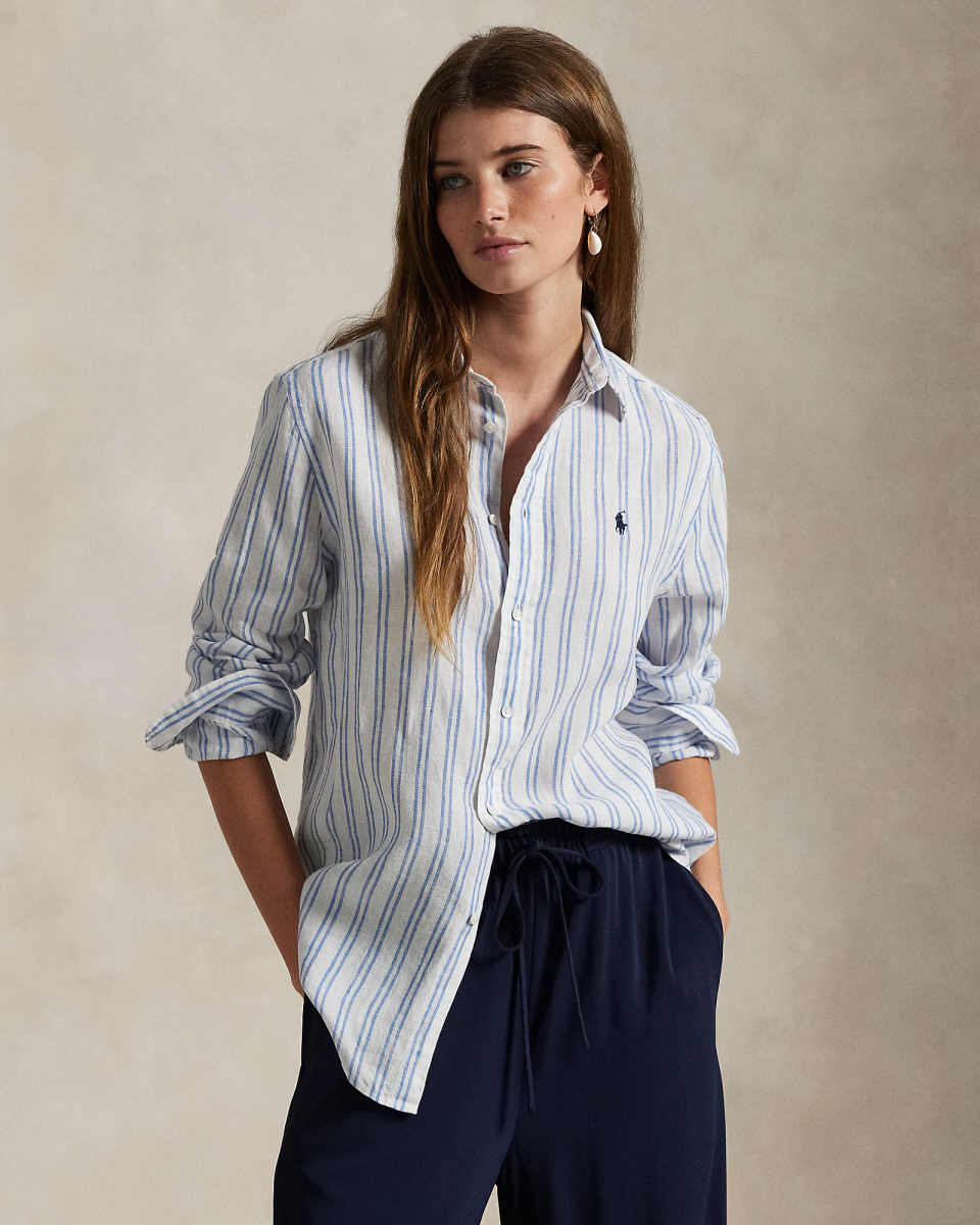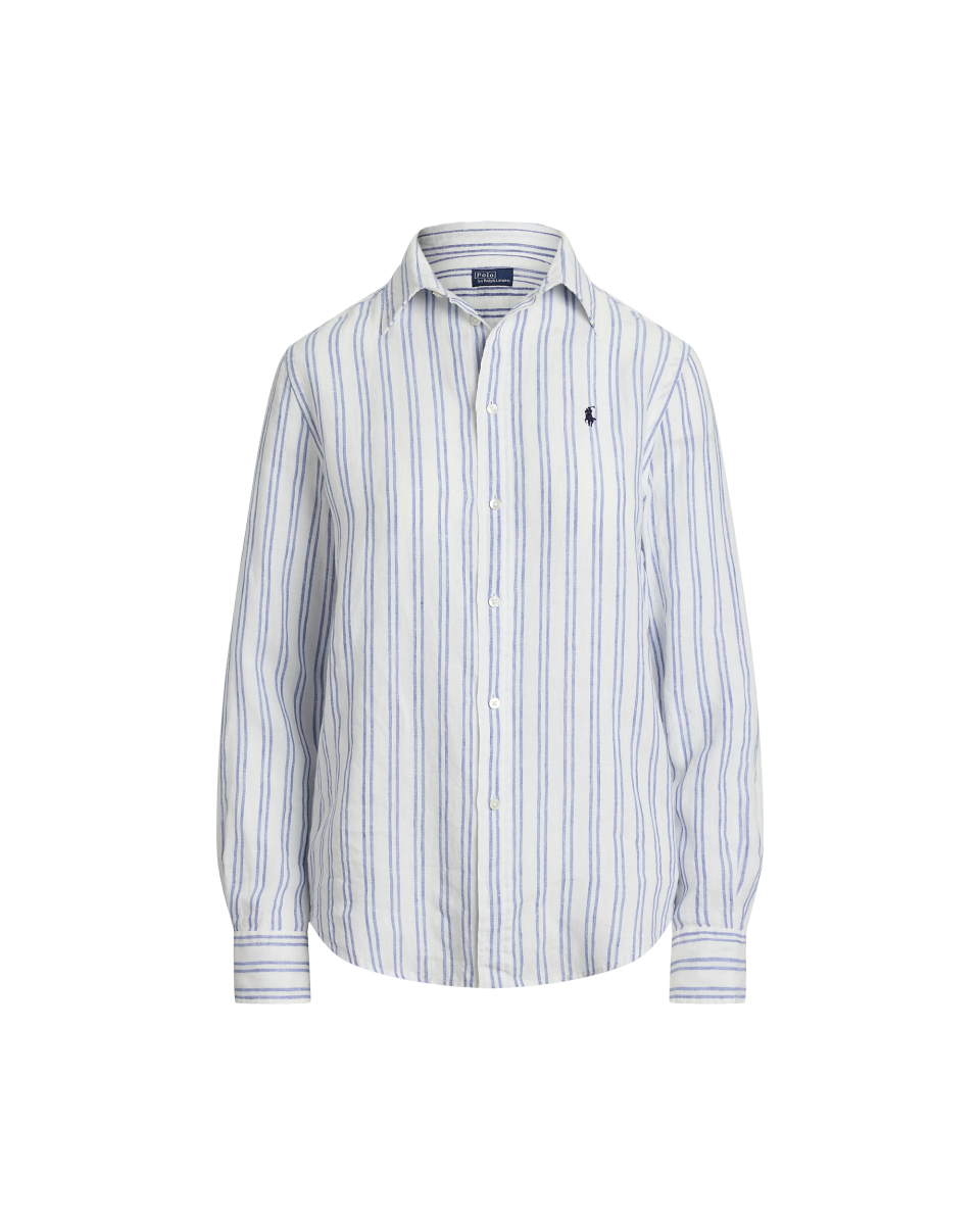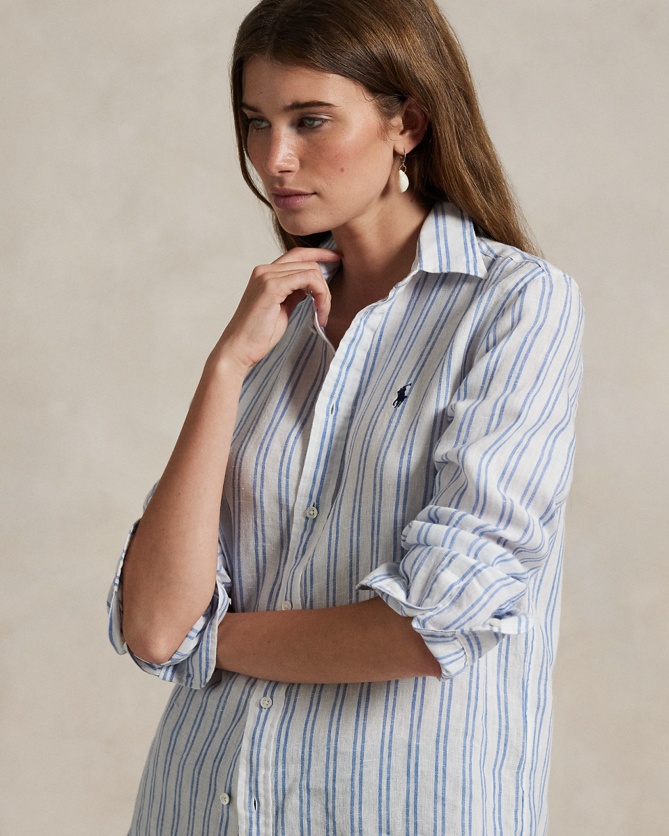 这款经典版型衬衫选用舒适的亚麻面料制成,饰有色织竖条纹图案,胸前饰有标志性小马刺绣