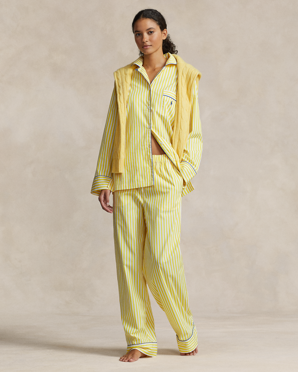 这款棉府绸睡衣裤套装包括三角凹口领长袖衬衫式睡衣和睡裤,饰有男装风格经典衬衫条纹,带撞色绲边,口袋饰有标志性小马刺绣