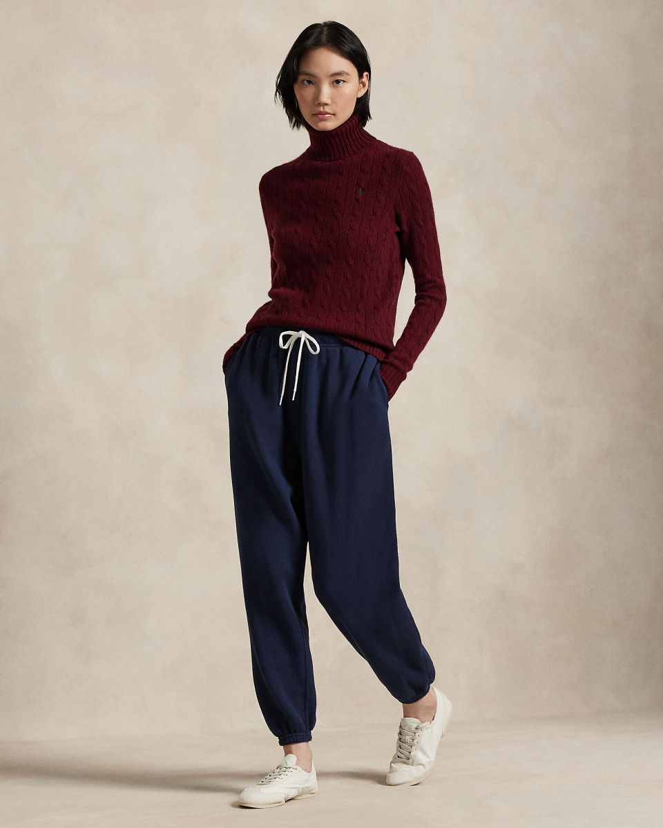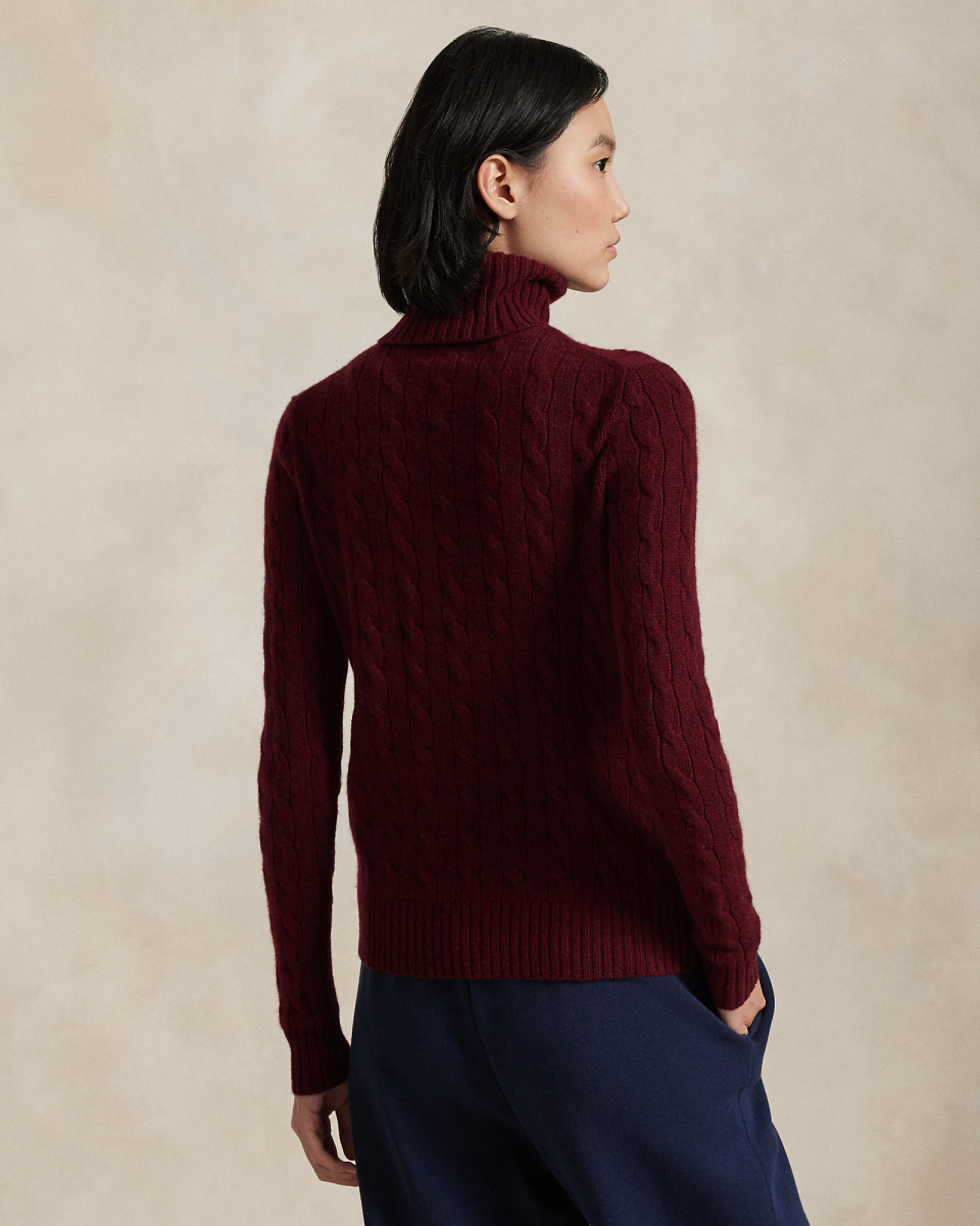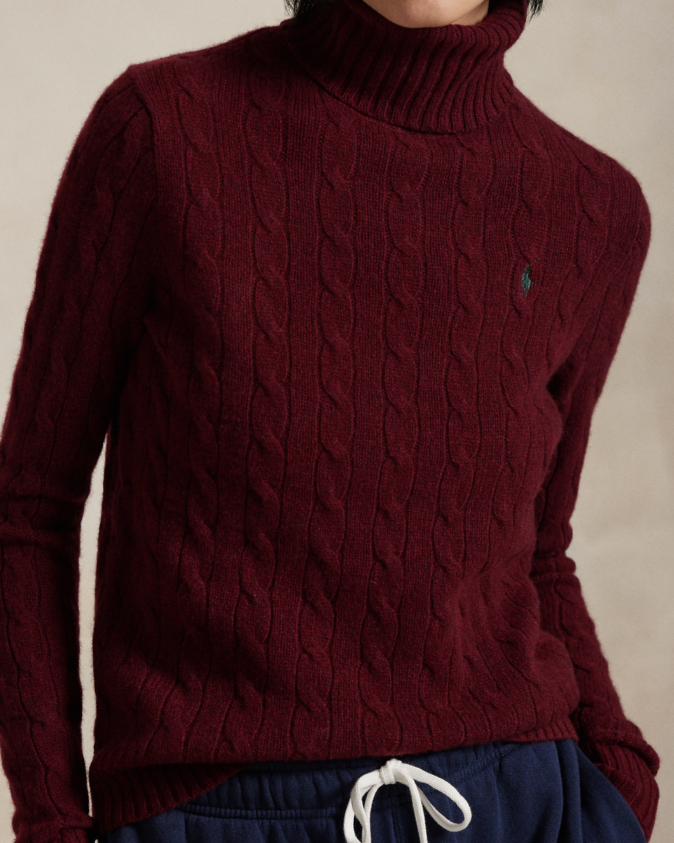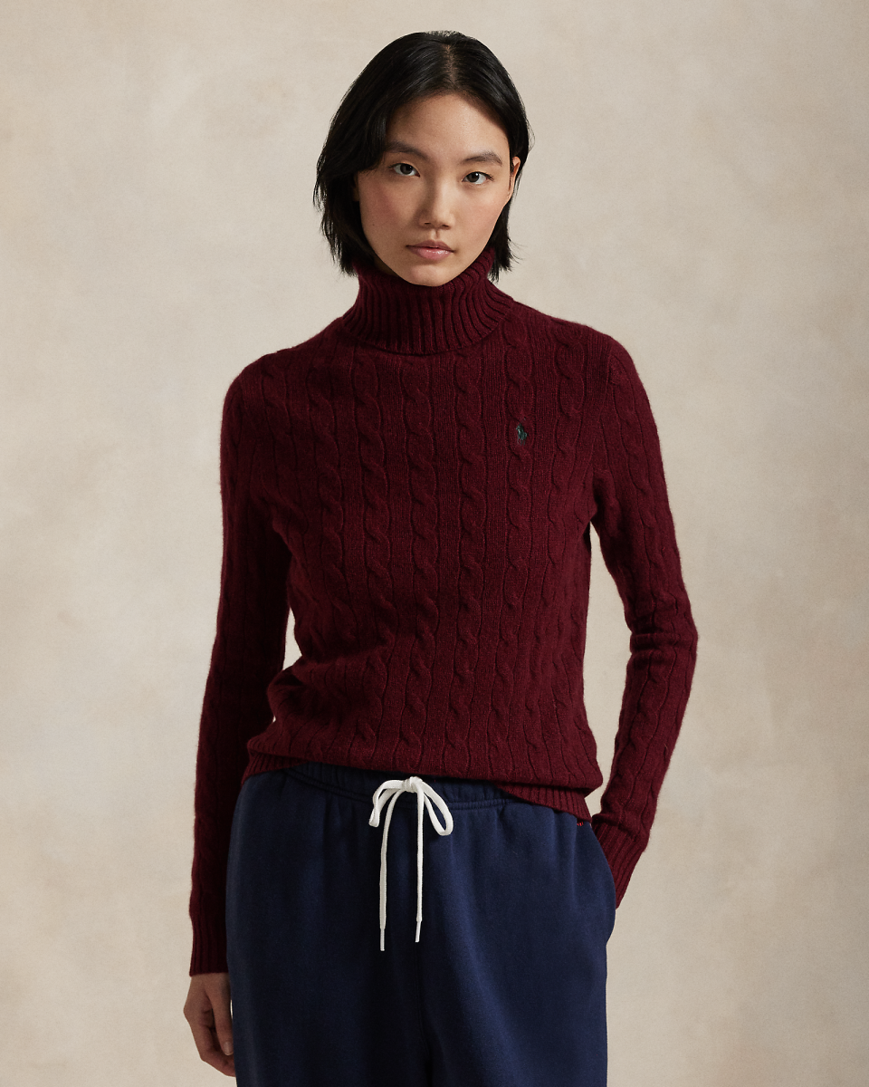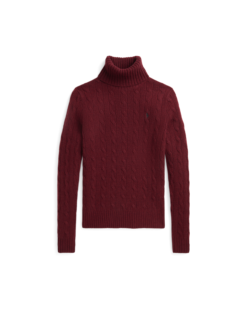这款高领针织毛衫采用 Polo 经典绞花编结构造,打造柔软质感,胸前饰有小马刺绣