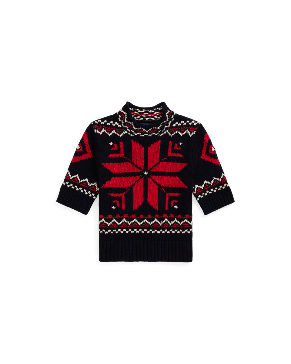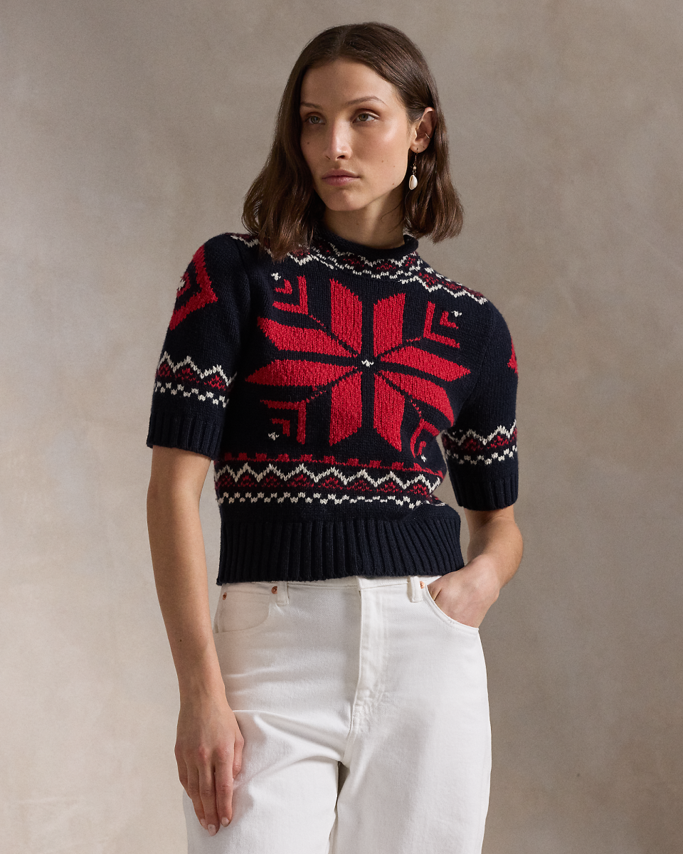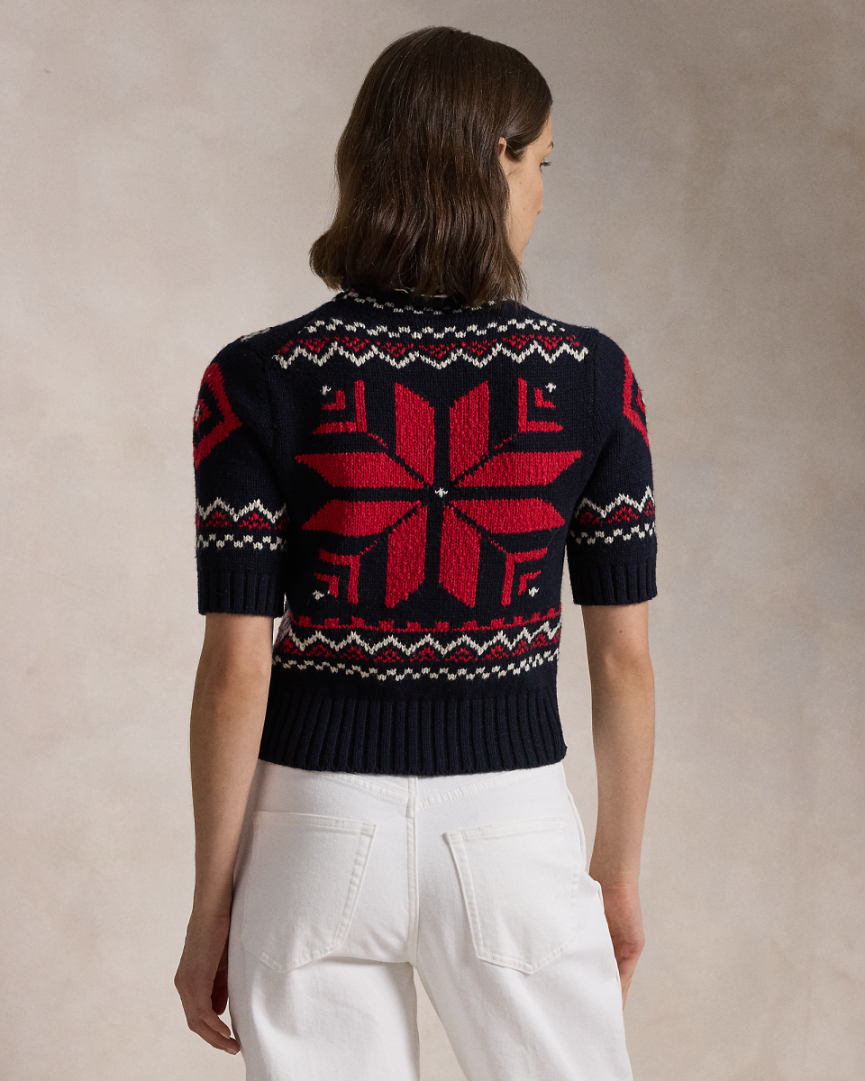 这款短袖针织毛衫选用舒适的面料制成,采用略微裁短的廓形,搭配卷边半高领,饰有嵌花编织雪花与菱形图案,搭配提花针织几何镶边