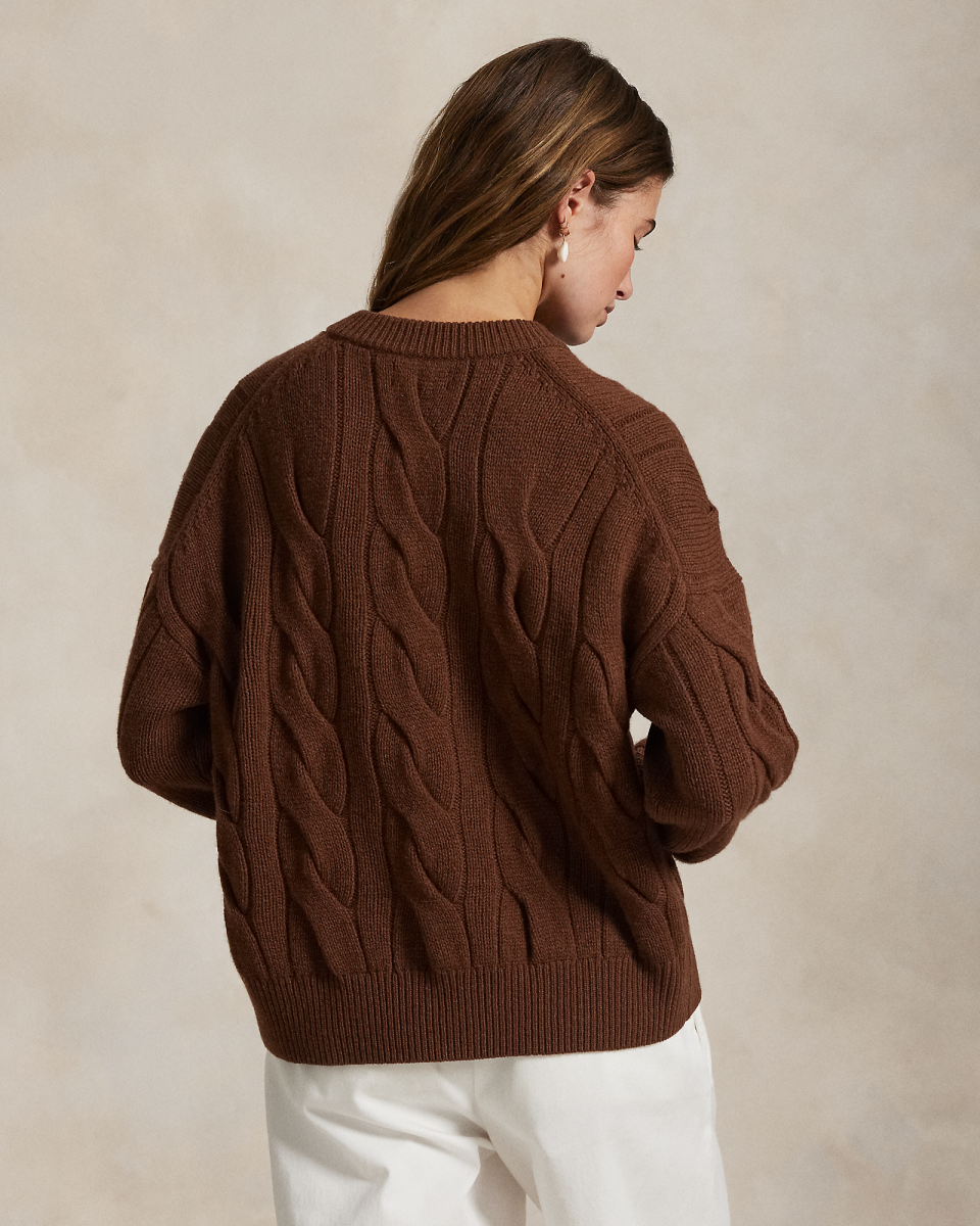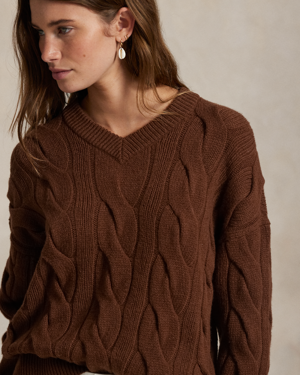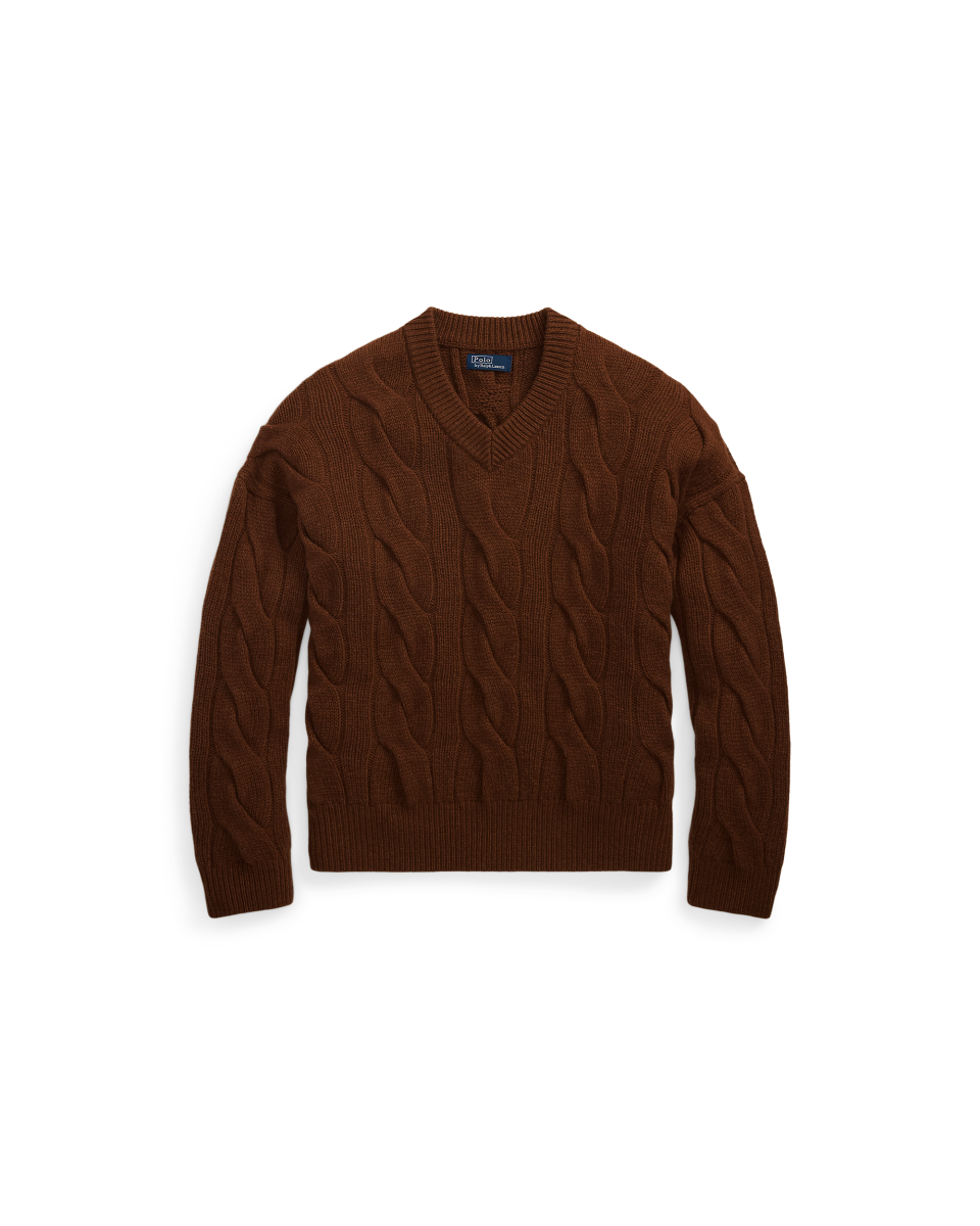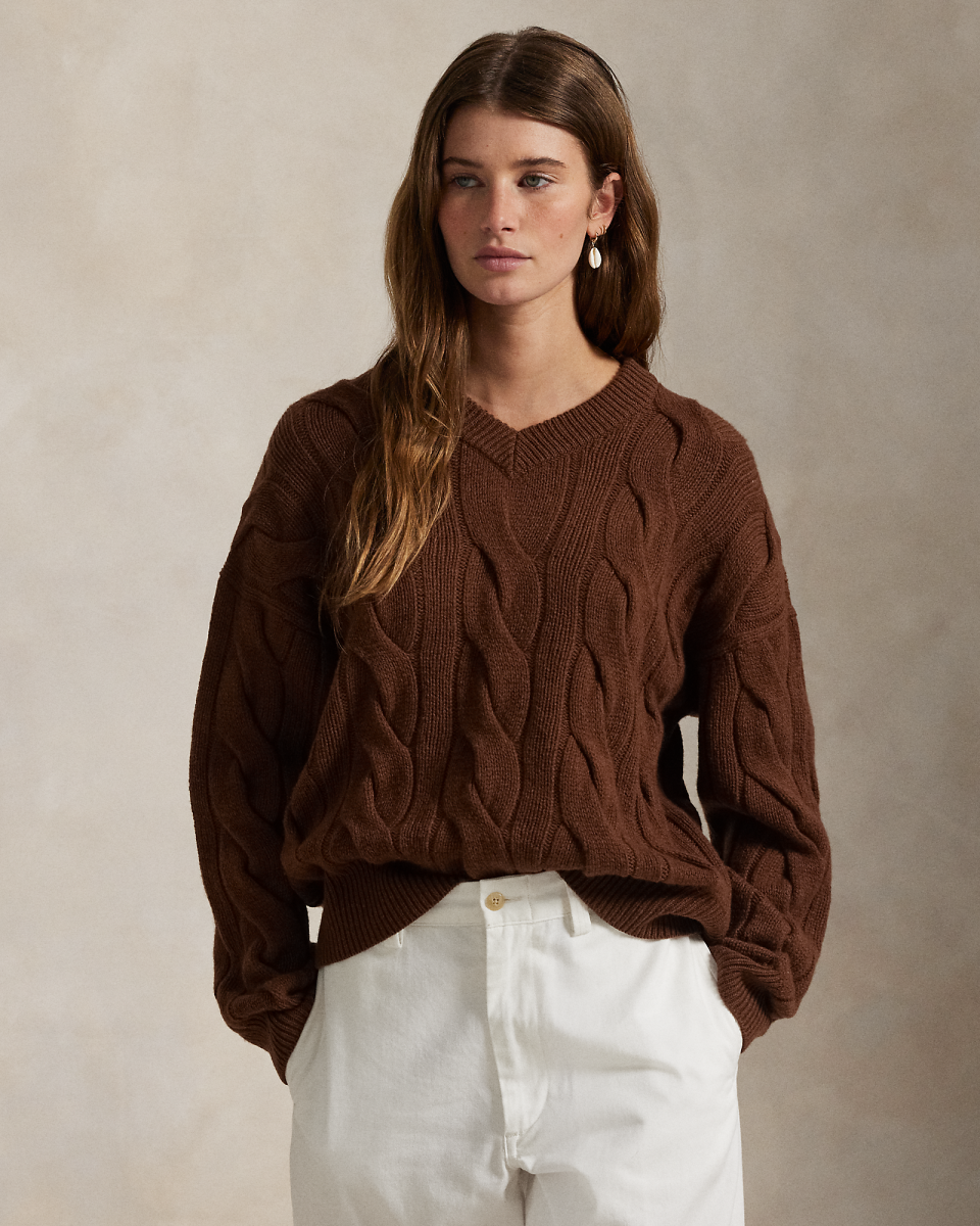 这款 V 领针织衫选用舒适的纱线织就,采用宽松廓形,饰有大尺寸标志性绞花编结纹理