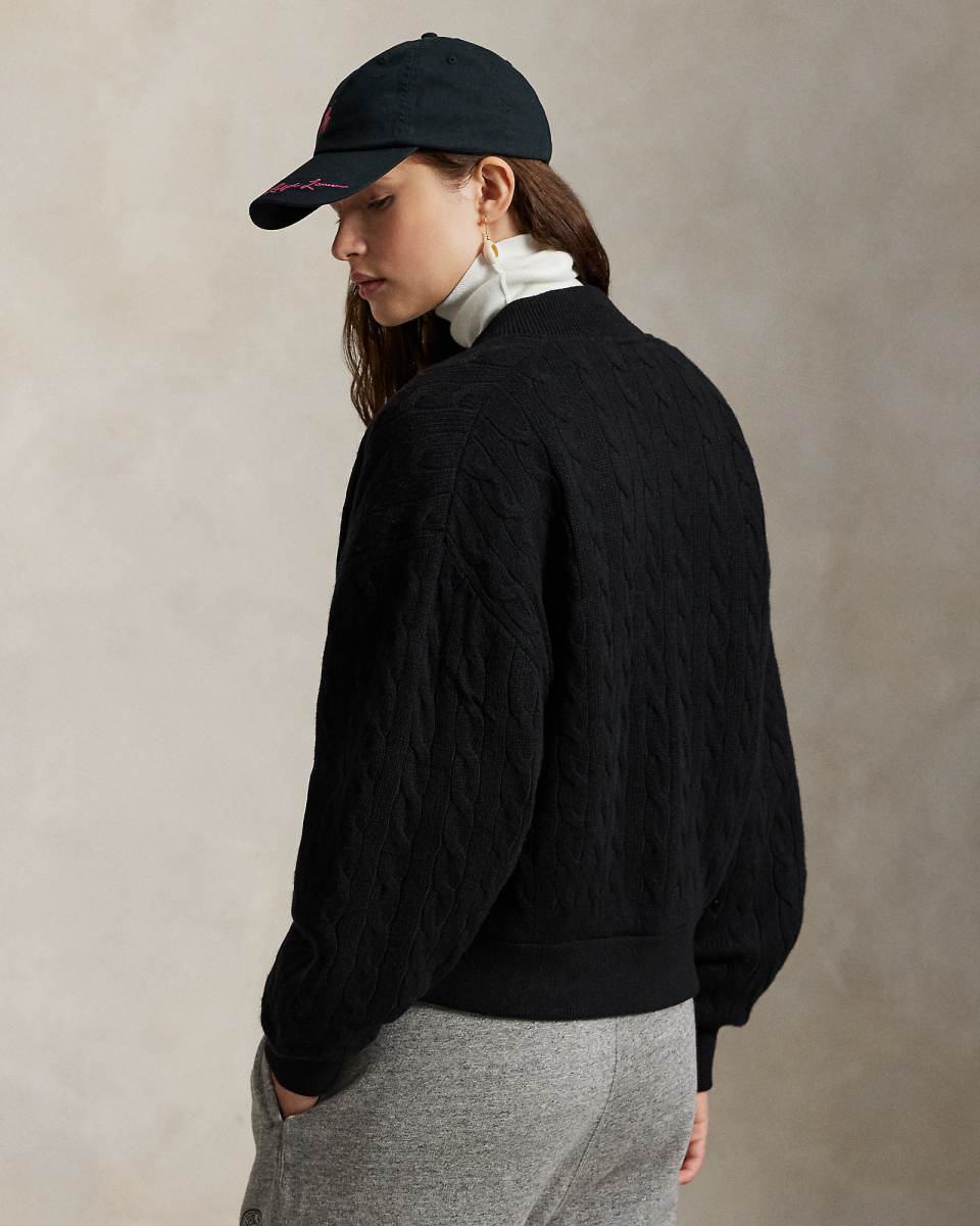 这款绞花编结棒球夹克选用舒适的面料制成