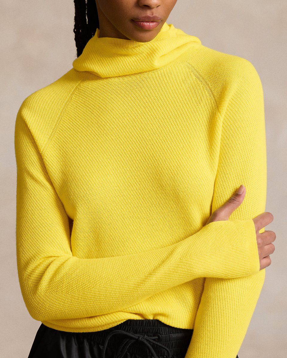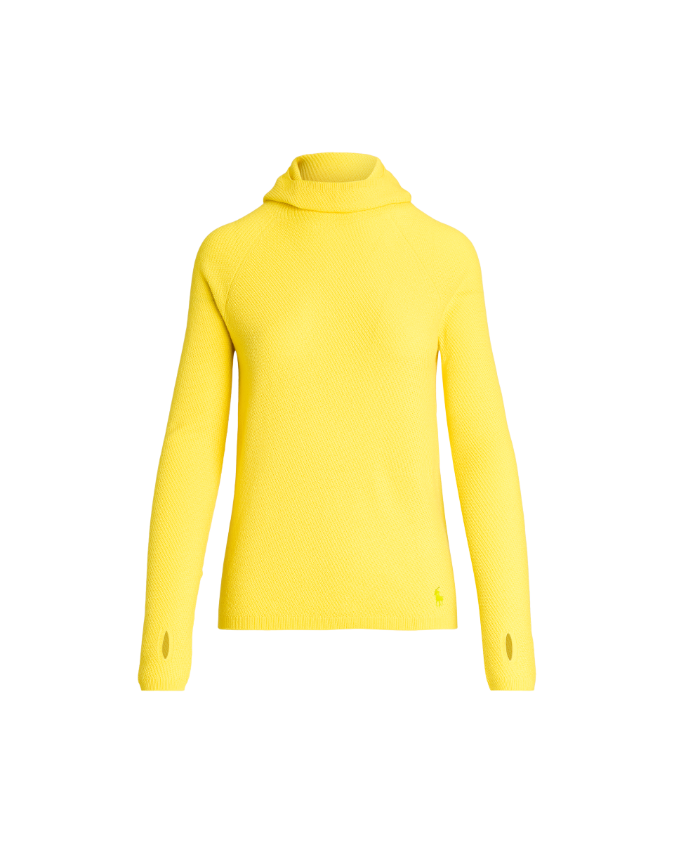 这款运动风套头衫选用舒适的羊毛纱线织就,配有围脖风帽和长袖,袖口带拇指孔,左侧下摆饰有经典小马胶浆印花,彰显标志性风格