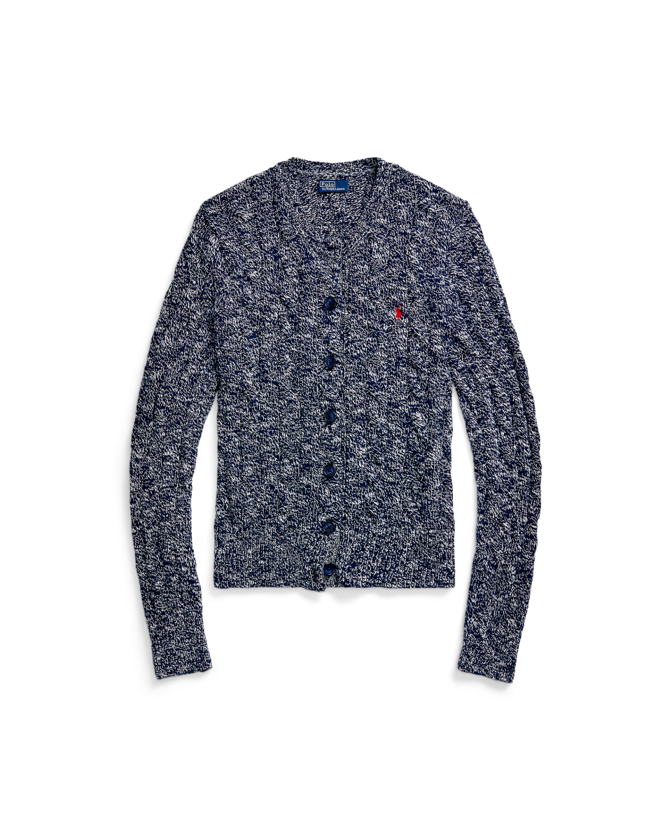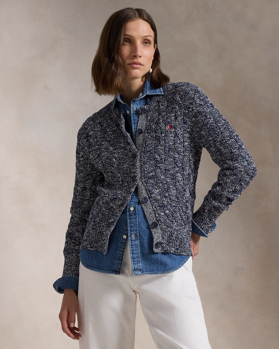 这款圆领针织开襟衫选用舒适的面料以经典绞花编结工艺制成,纽扣式门襟带扇形边缘