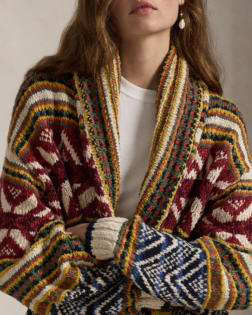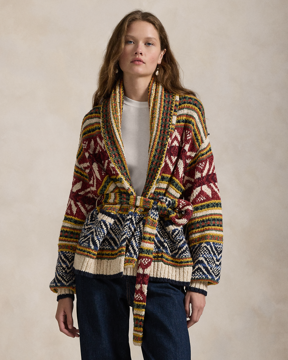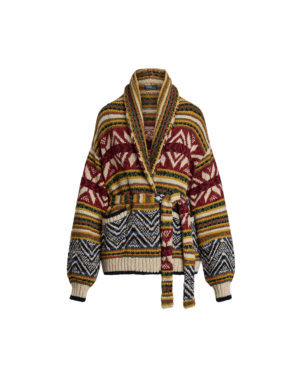 这款配腰带青果领针织开襟衫选用舒适的厚实纱线以底面浮线提花针织工艺制成,饰有几何图案和彩色条纹
