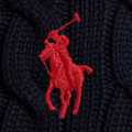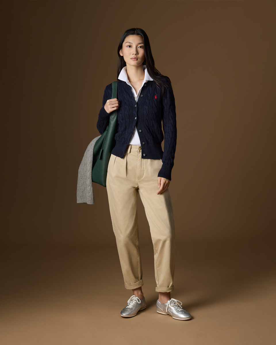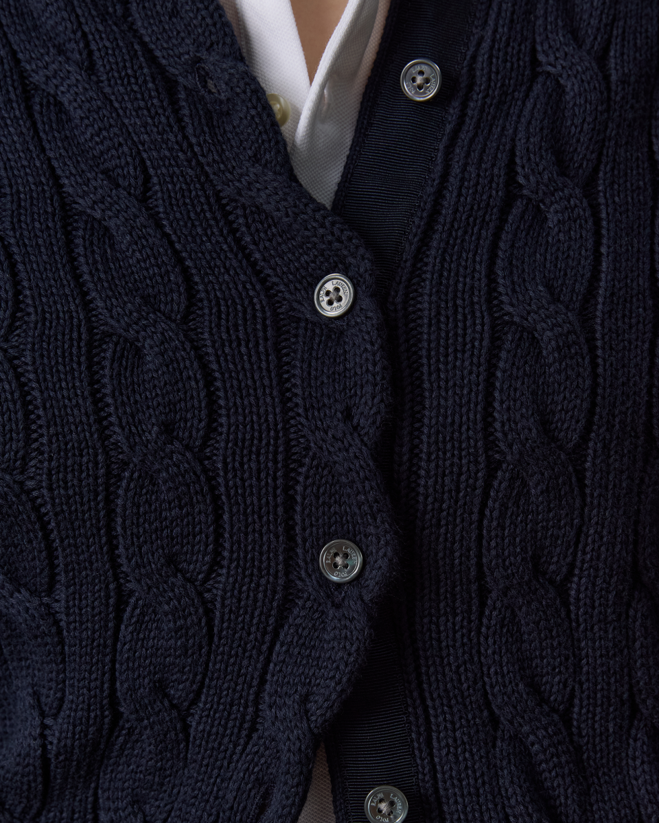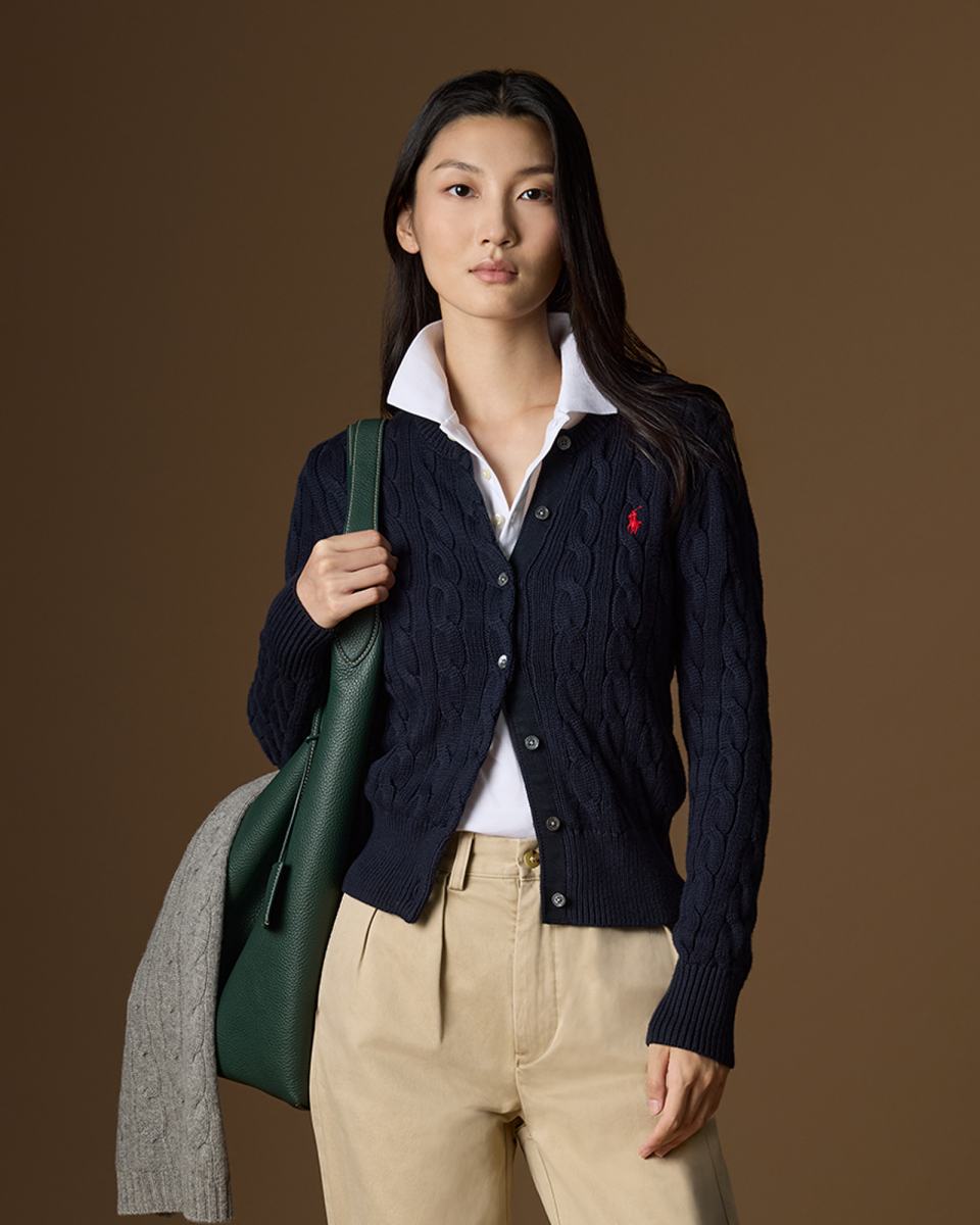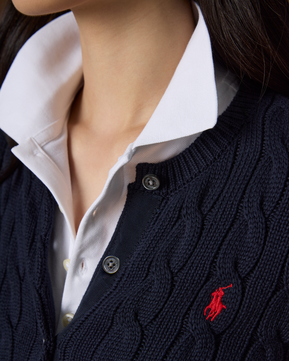 这款纽扣圆领开襟衫选用柔软的棉质面料以绞花编结工艺织就,胸前饰有标志性小马刺绣
