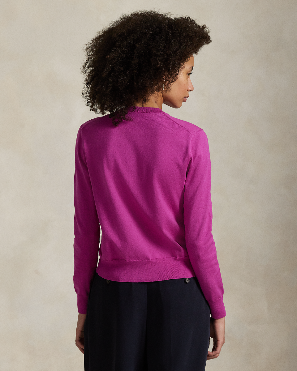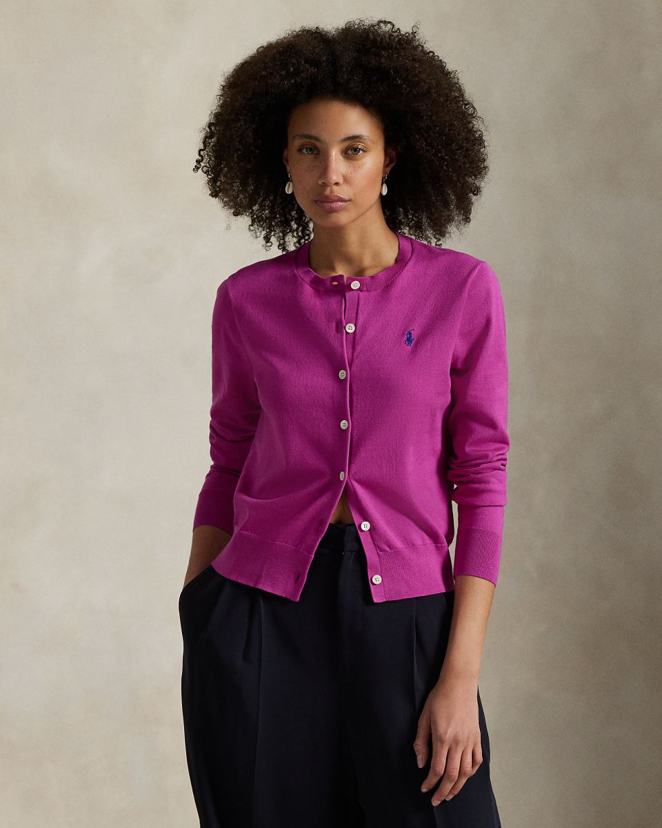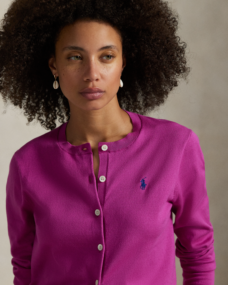 这款圆领针织开襟衫选用顺滑的面料制成,搭配纽扣式门襟,胸前饰有标志性小马刺绣