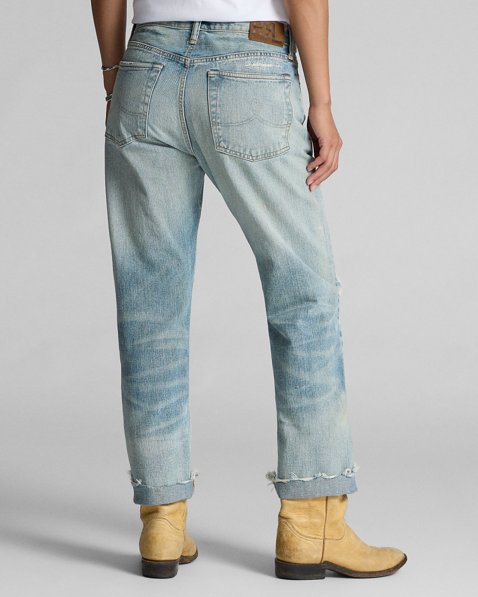 这款直筒牛仔裤选用 13.7 盎司镶边牛仔布制成。所用的左斜纹布梭织而成。纽扣门襟。零钱口袋上饰有 RRL 字样刺绣。毛边下摆。经重度水洗处理,饰有补丁。采用 Sanforized® 预缩处理,尽可能减轻缩水情况