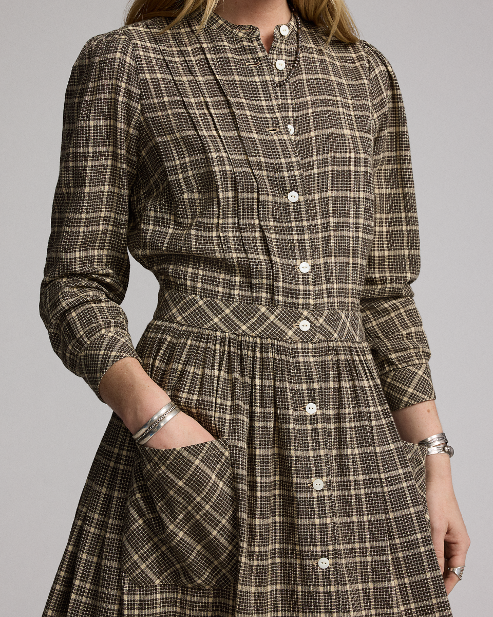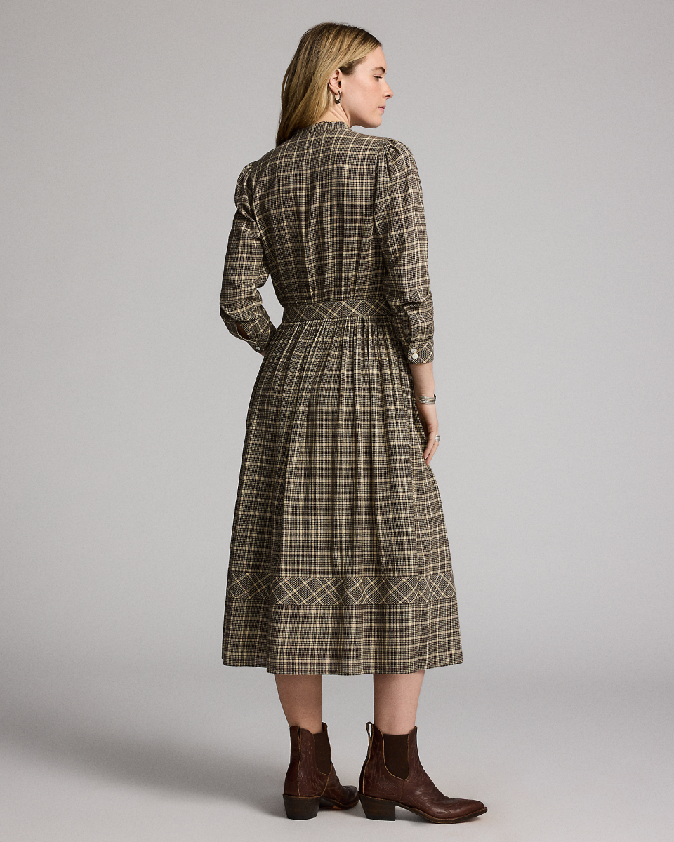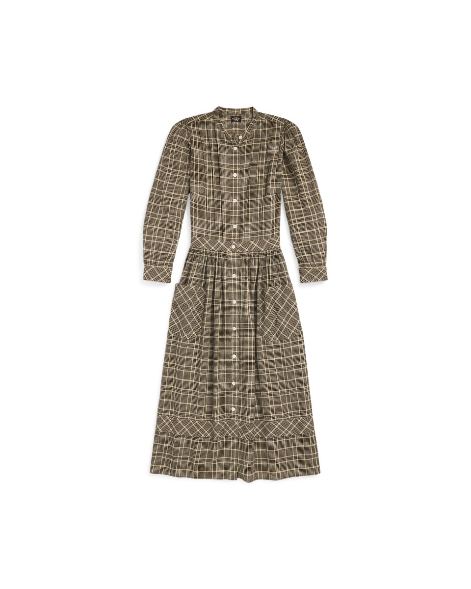 这款连衣裙选用轻盈的棉质小提花布制成,呈现手织风格,饰有基于复古面料样品的格纹图案,灵感源自 20 世纪早期的一件女式衬衫,上身饰有缩褶和针裥