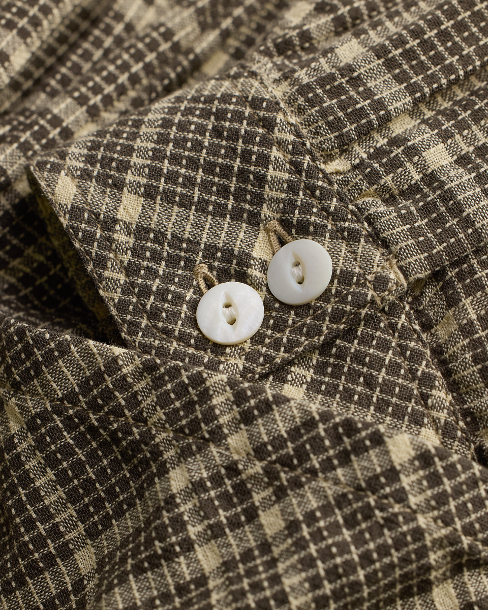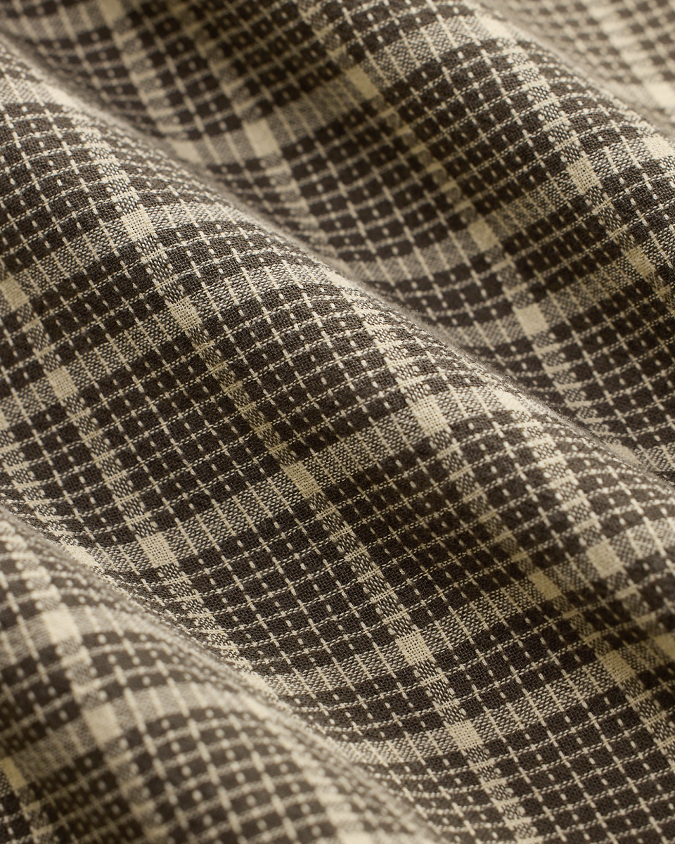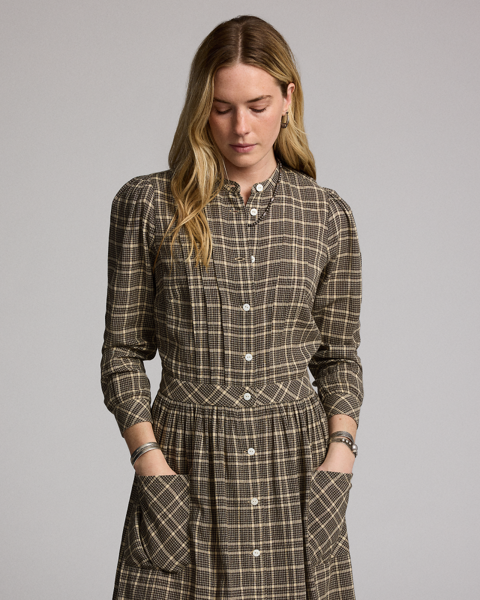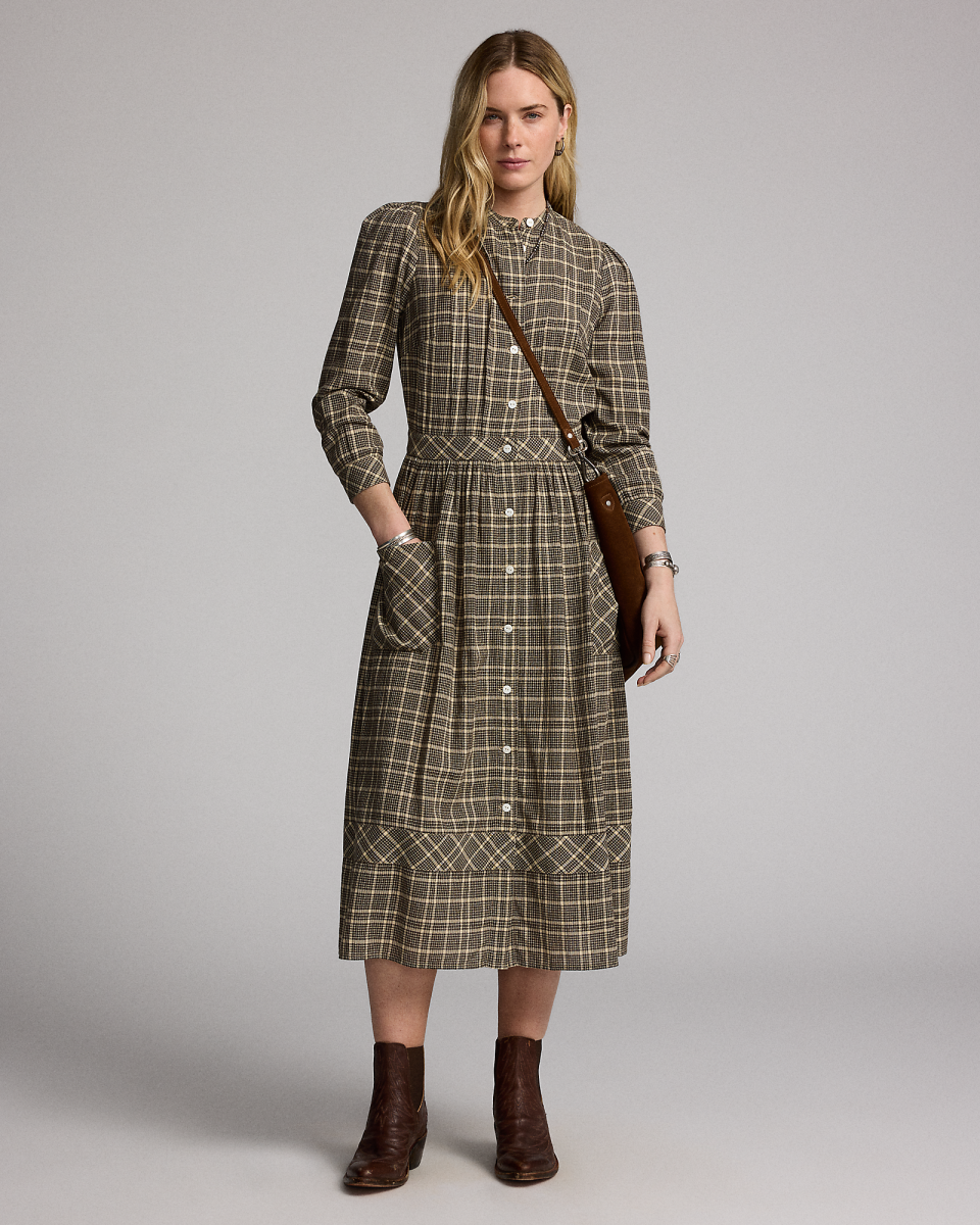 这款连衣裙选用轻盈的棉质小提花布制成,呈现手织风格,饰有基于复古面料样品的格纹图案,灵感源自 20 世纪早期的一件女式衬衫,上身饰有缩褶和针裥