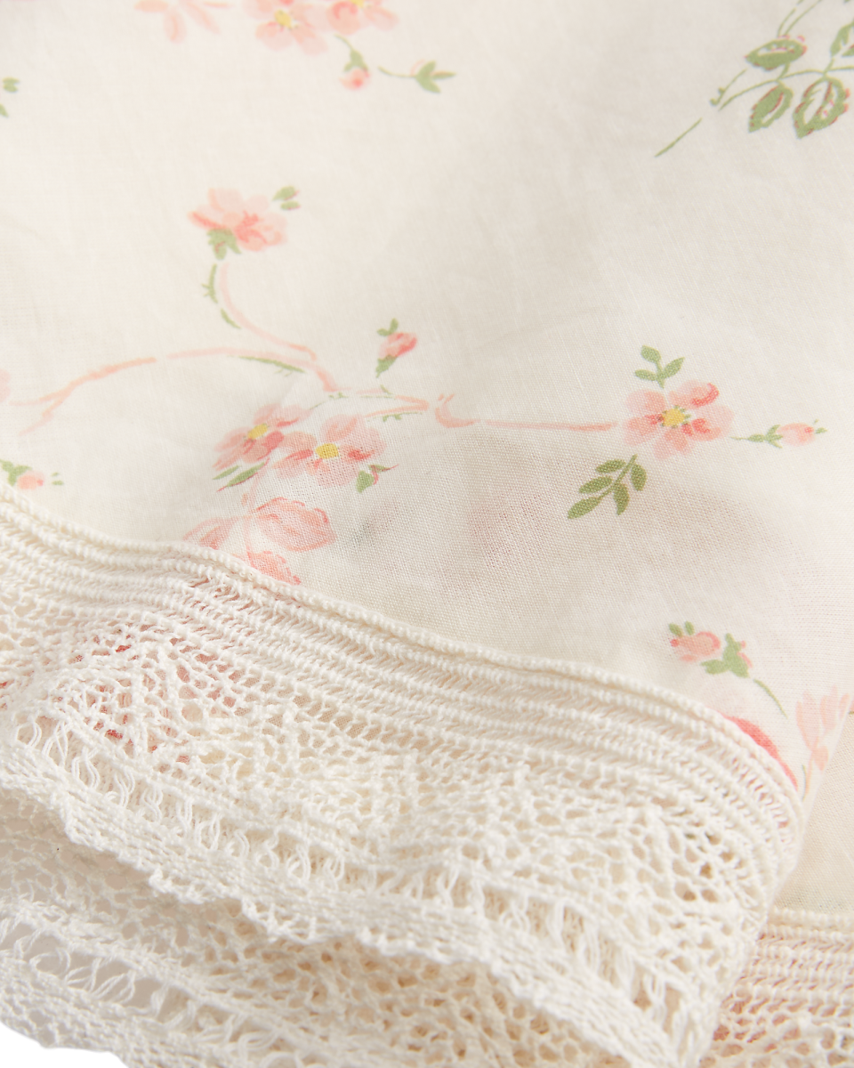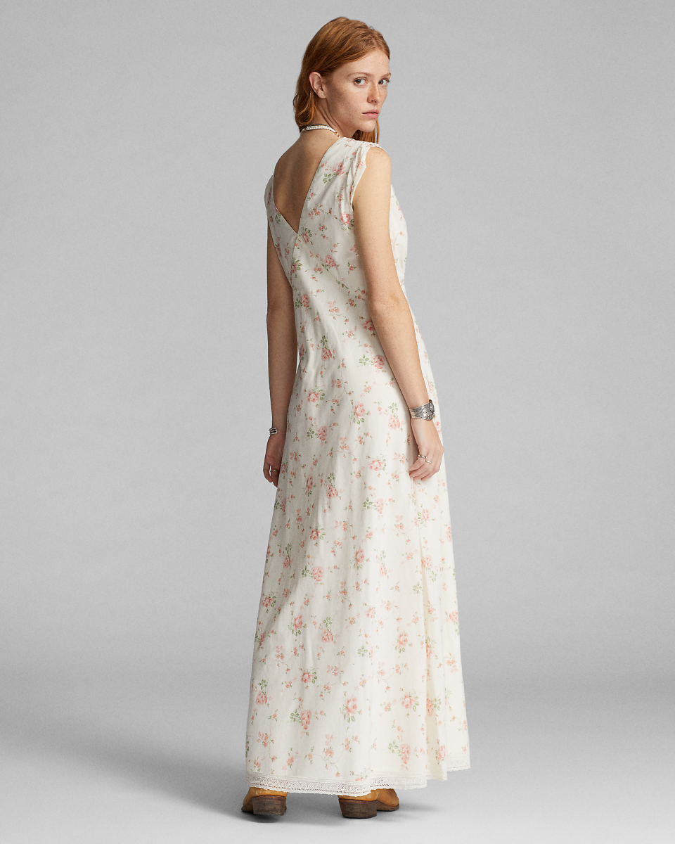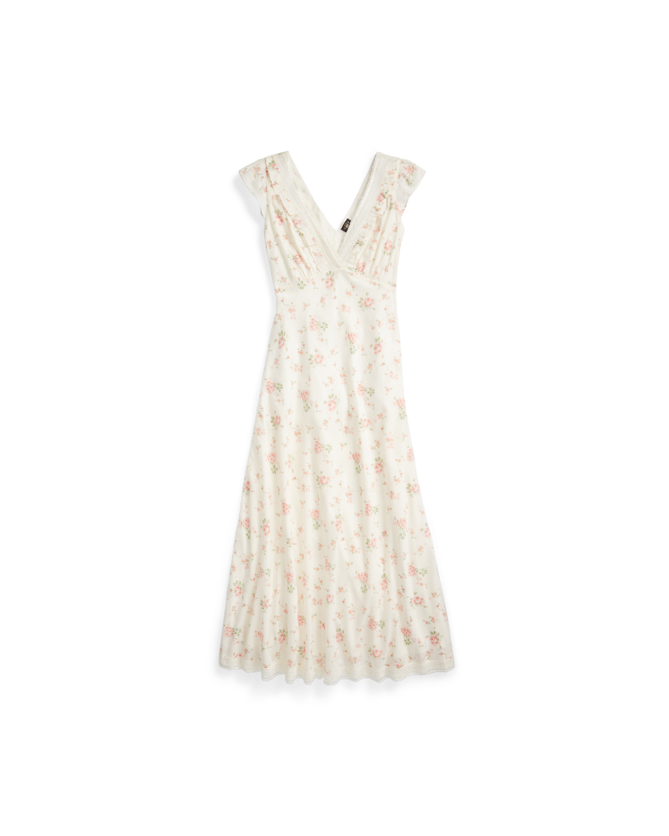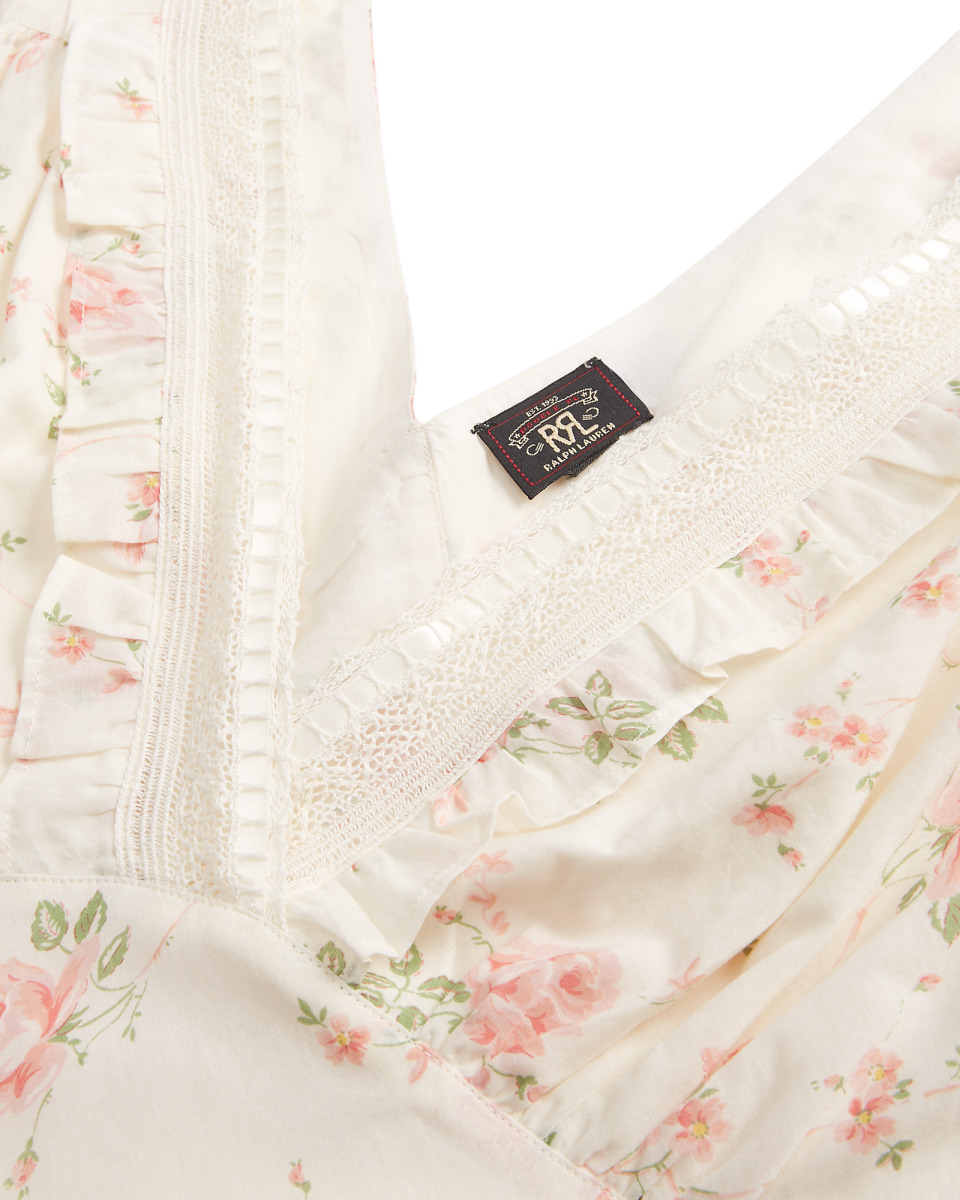 这款斜裁连衣裙选用花卉印花棉质薄纱制成,衣身饰有缩褶,领口与裙摆配有蕾丝饰边