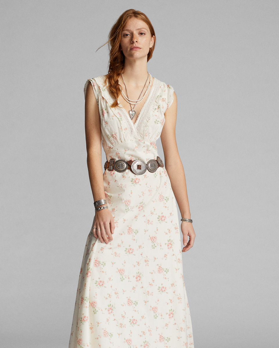 蕾丝饰边花卉棉质薄纱连衣裙