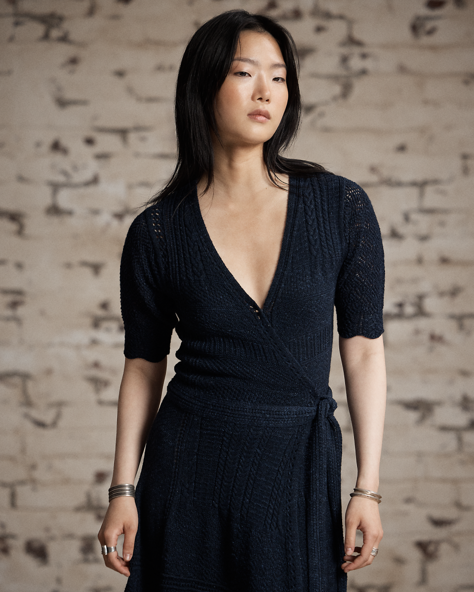 这款裹身式连衣裙选用经过预捻处理的纱线织就,质地柔软,采用拼饰风格设计,融入雅致的提花针织网眼纹理与根西岛风格图案,满版饰以混搭绞花纹理和新颖缝线,裙腰配有可系结的同种面料腰带