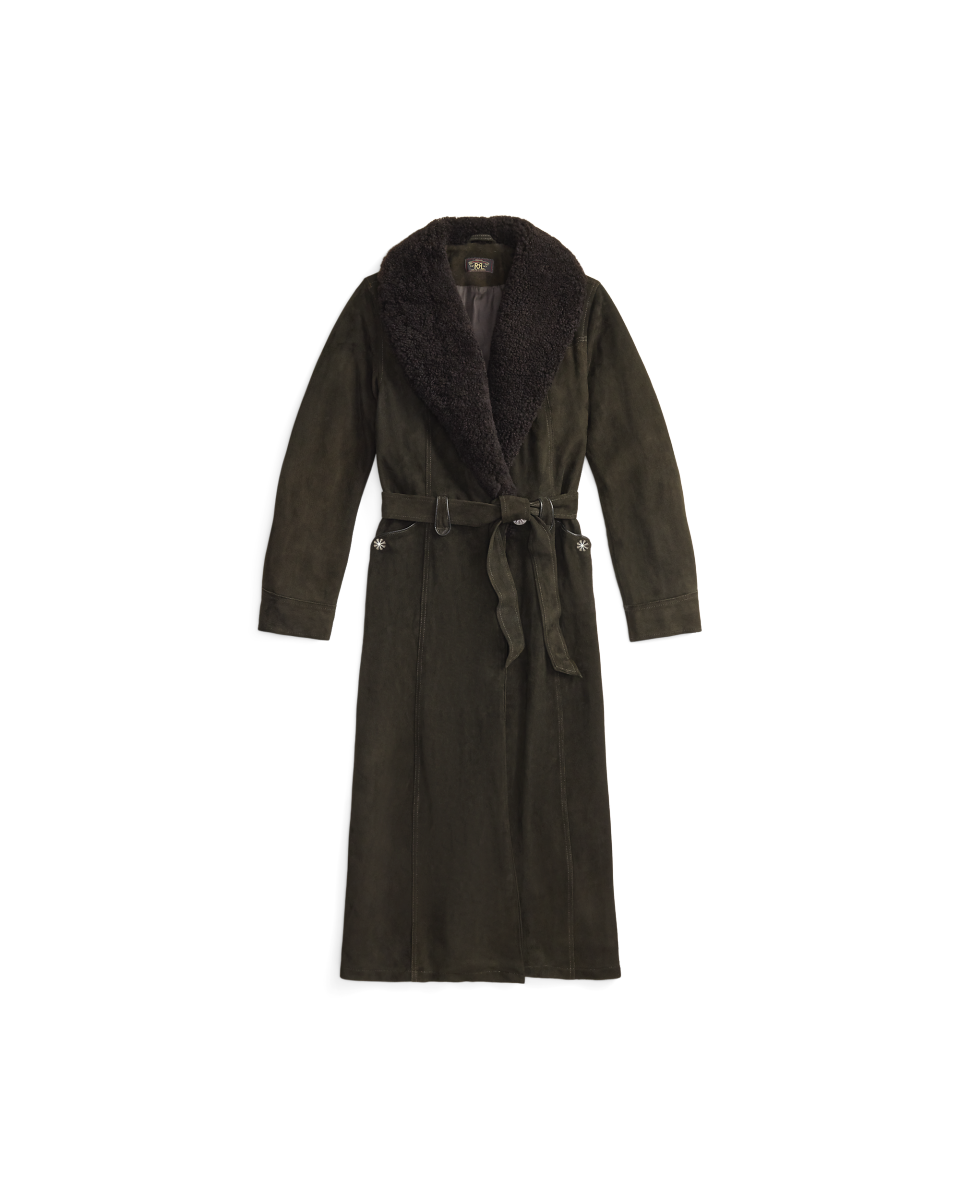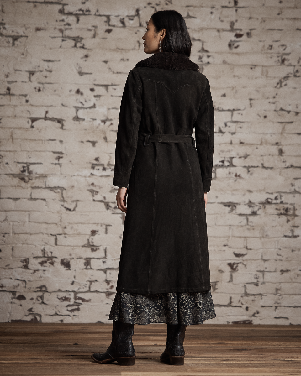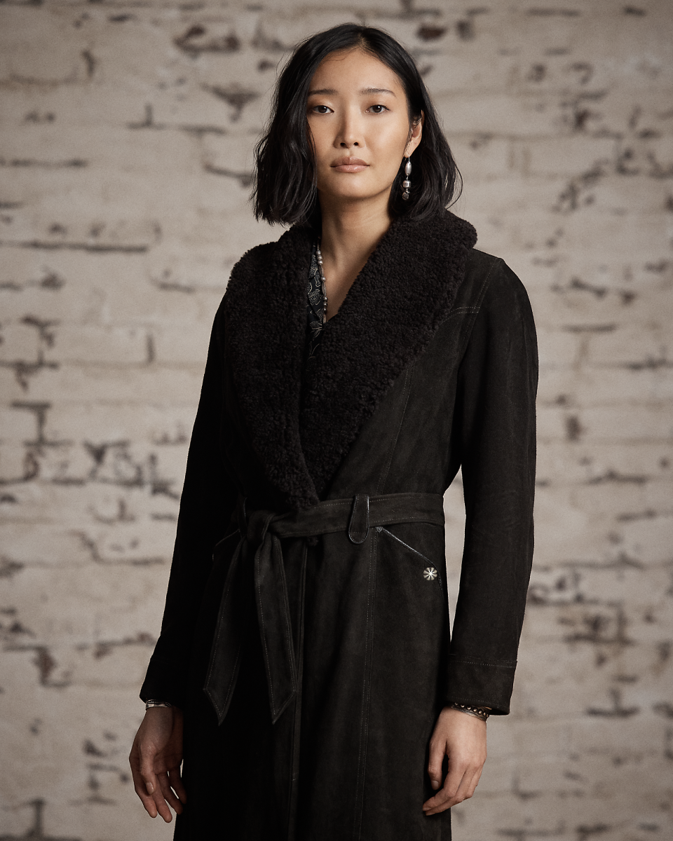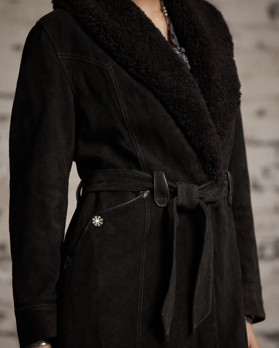 这款外套选用轻盈的黑棕色鹿绒面革制成,配有青果领,灵感源自上个世纪 60 年代的一件夹克,采用裹身式廓形,配有同种面料腰带,正面腰部左侧配有金属纽扣,美式西部风格过肩和口袋均有绲边,经特定处理,呈现复古外观