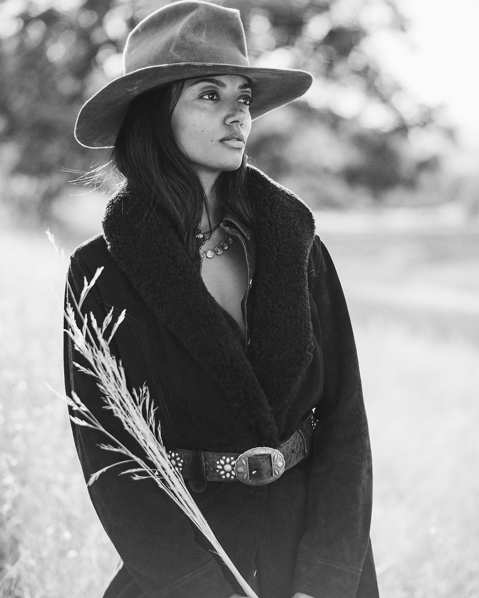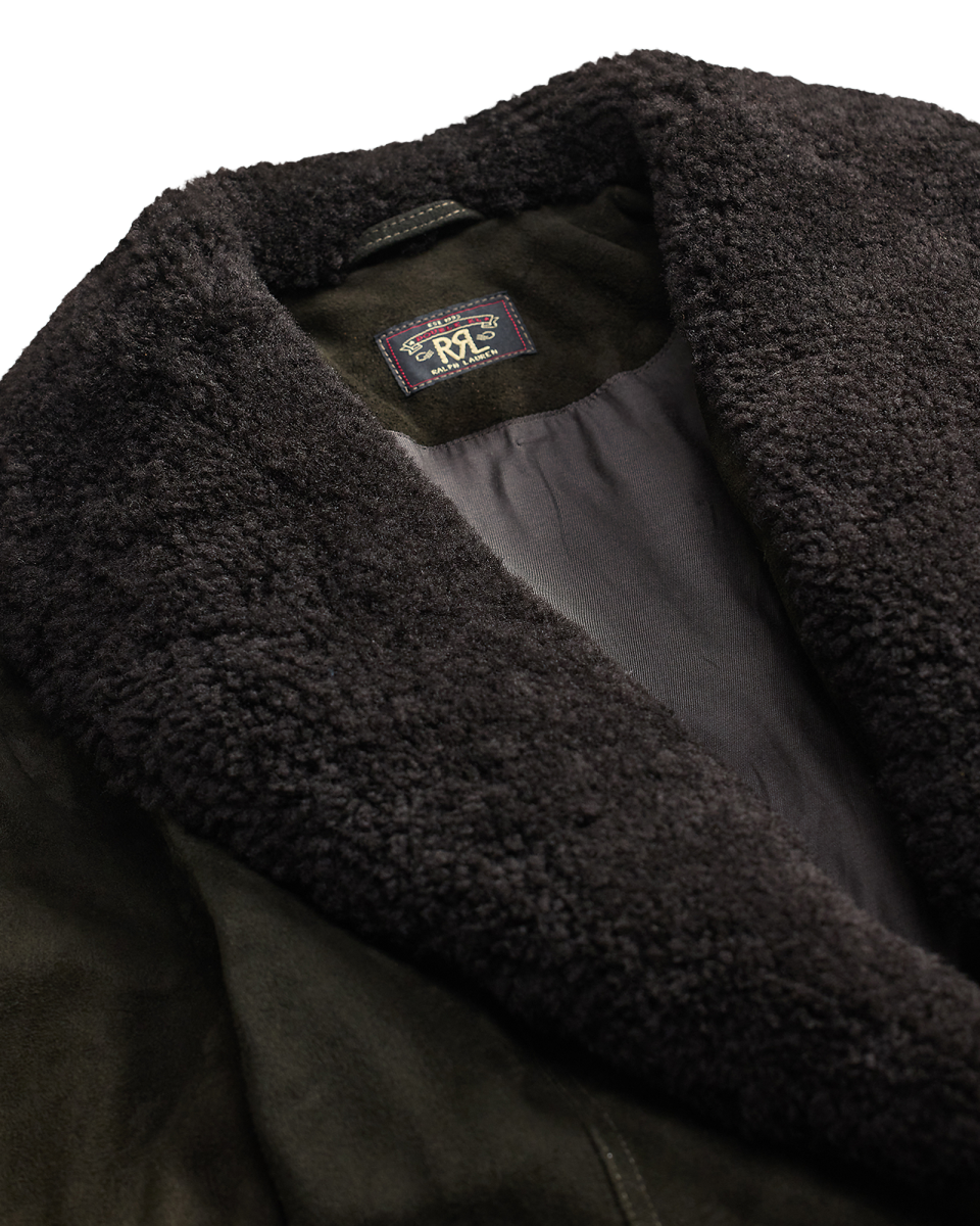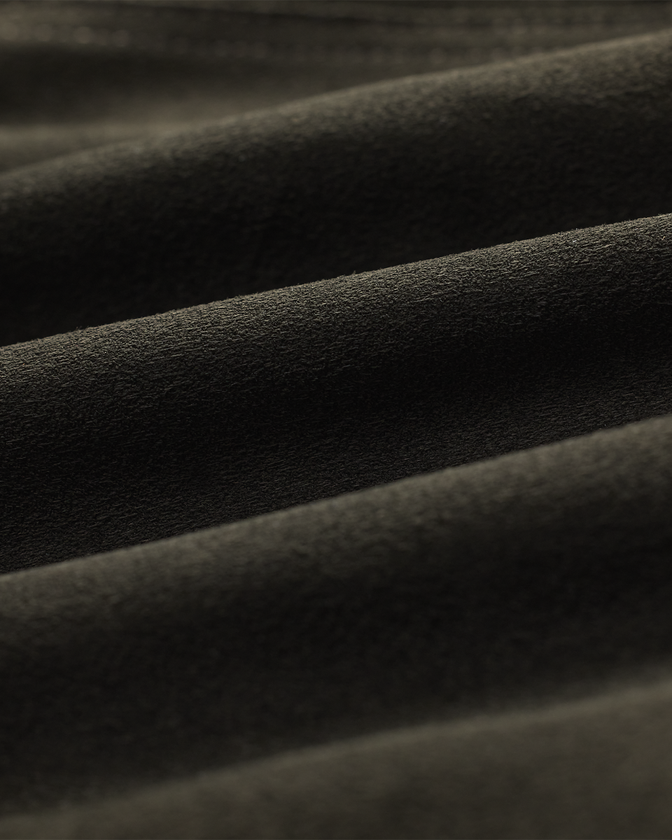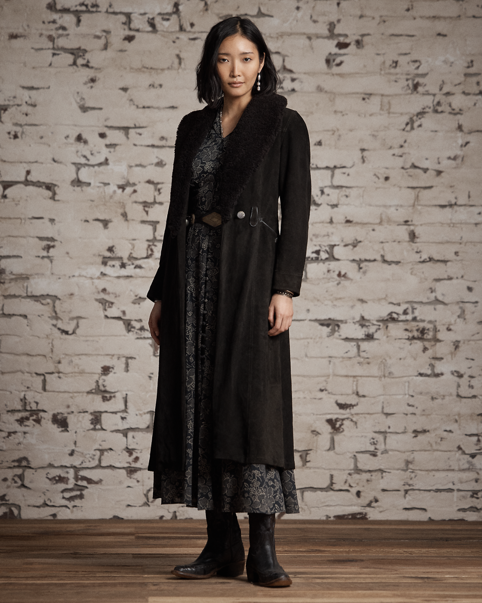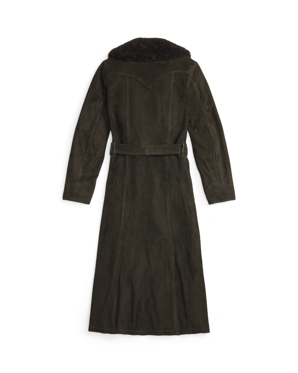 这款外套选用轻盈的黑棕色鹿绒面革制成,配有青果领,灵感源自上个世纪 60 年代的一件夹克,采用裹身式廓形,配有同种面料腰带,正面腰部左侧配有金属纽扣,美式西部风格过肩和口袋均有绲边,经特定处理,呈现复古外观