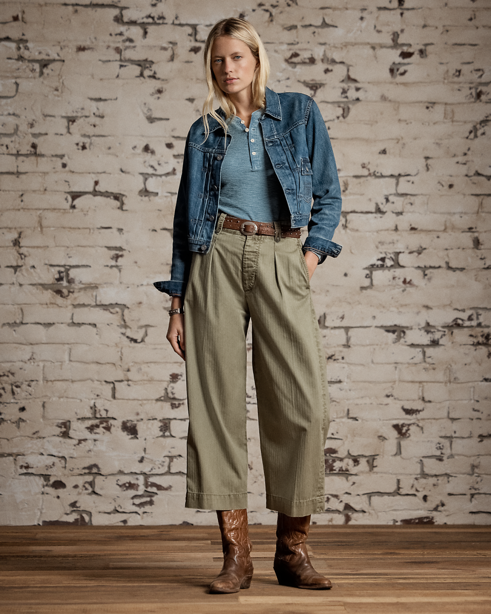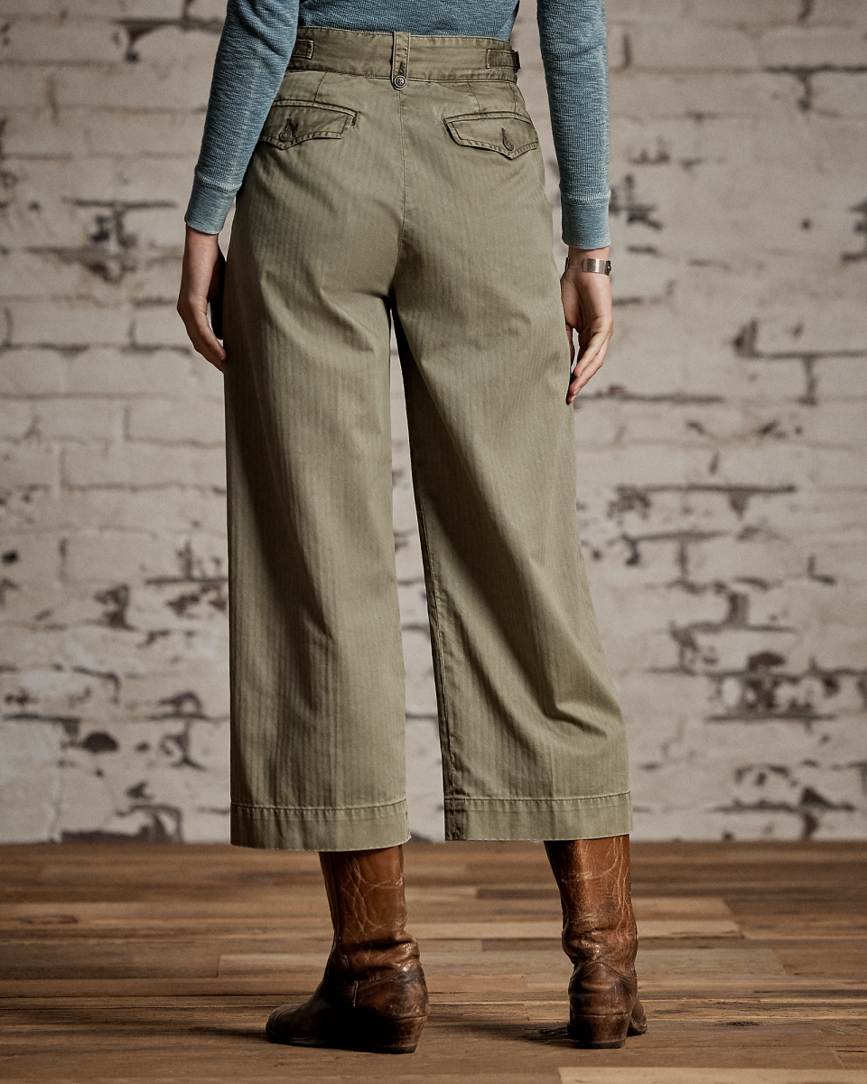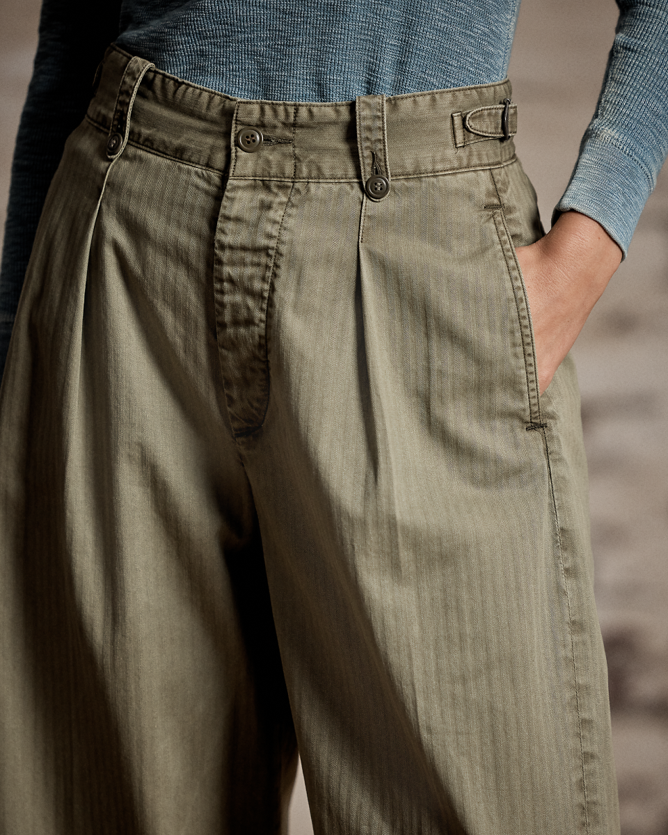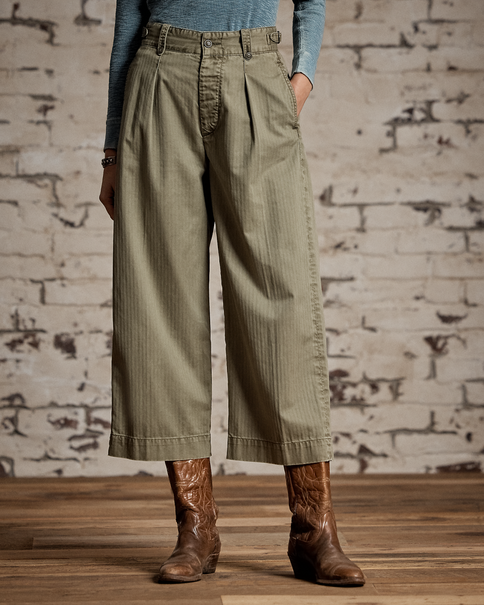 这款九分阔腿裤灵感源自上个世纪 40 年代的裤子,选用匹染斜纹棉布制成,背面配有缝制的有盖口袋,正面饰有缝合式褶裥,侧边有纽扣式腰带环和可调节扣袢