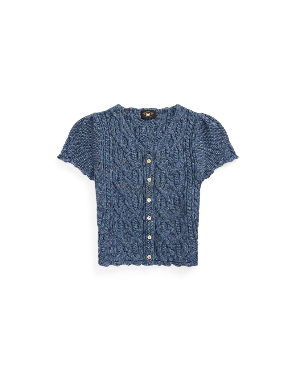 这款上衣选用舒适的面料制成,灵感源自复古针织衫,纱线经过预捻处理,打造柔软质地,采用根西岛风格设计,采用 Aran 针织设计,满版饰有混搭绞花纹理和种子绣缝线