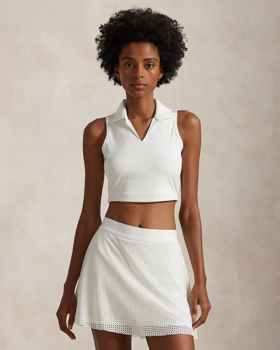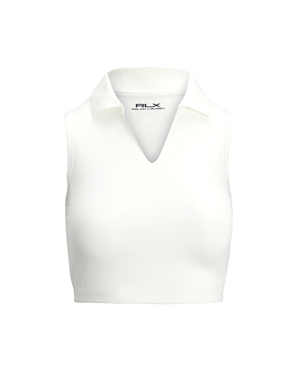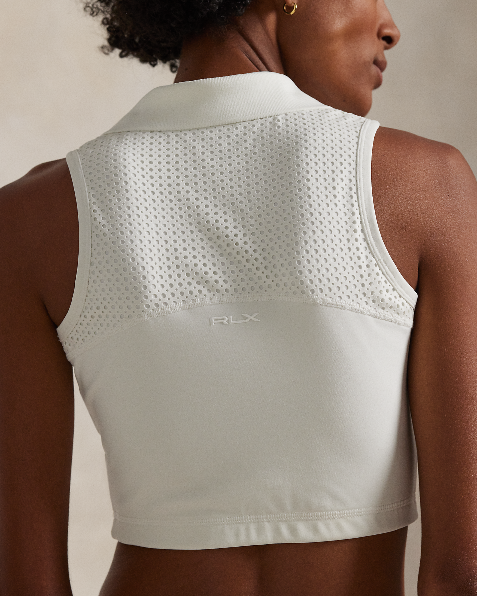 这款无袖运动 Polo 衫选用双面布制成,采用短款廓形,具有良好的弹性和出色的形状恢复性能,背面拼片有孔眼,背面中间饰有标志性 RLX 字样徽标