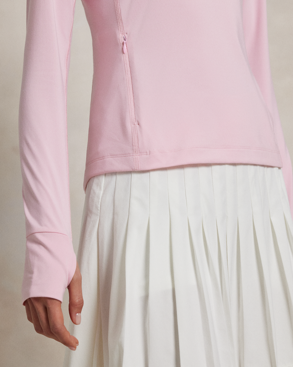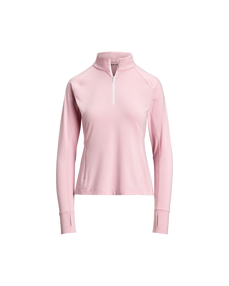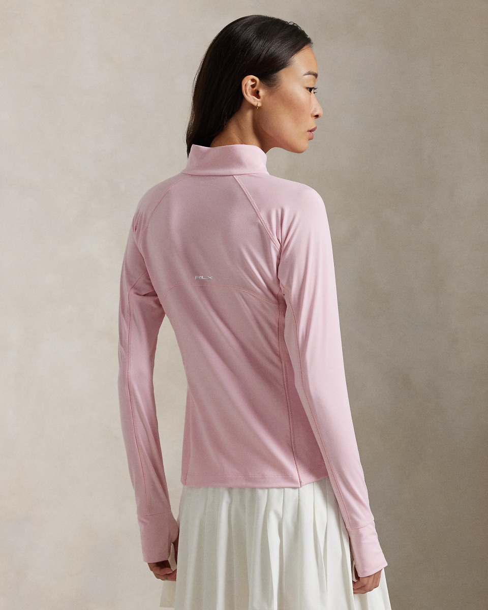 这款四分之一拉链套头衫选用弹力磨毛平纹针织面料制成,采用拼片结构,背面中间印有标志性 RLX 字样徽标