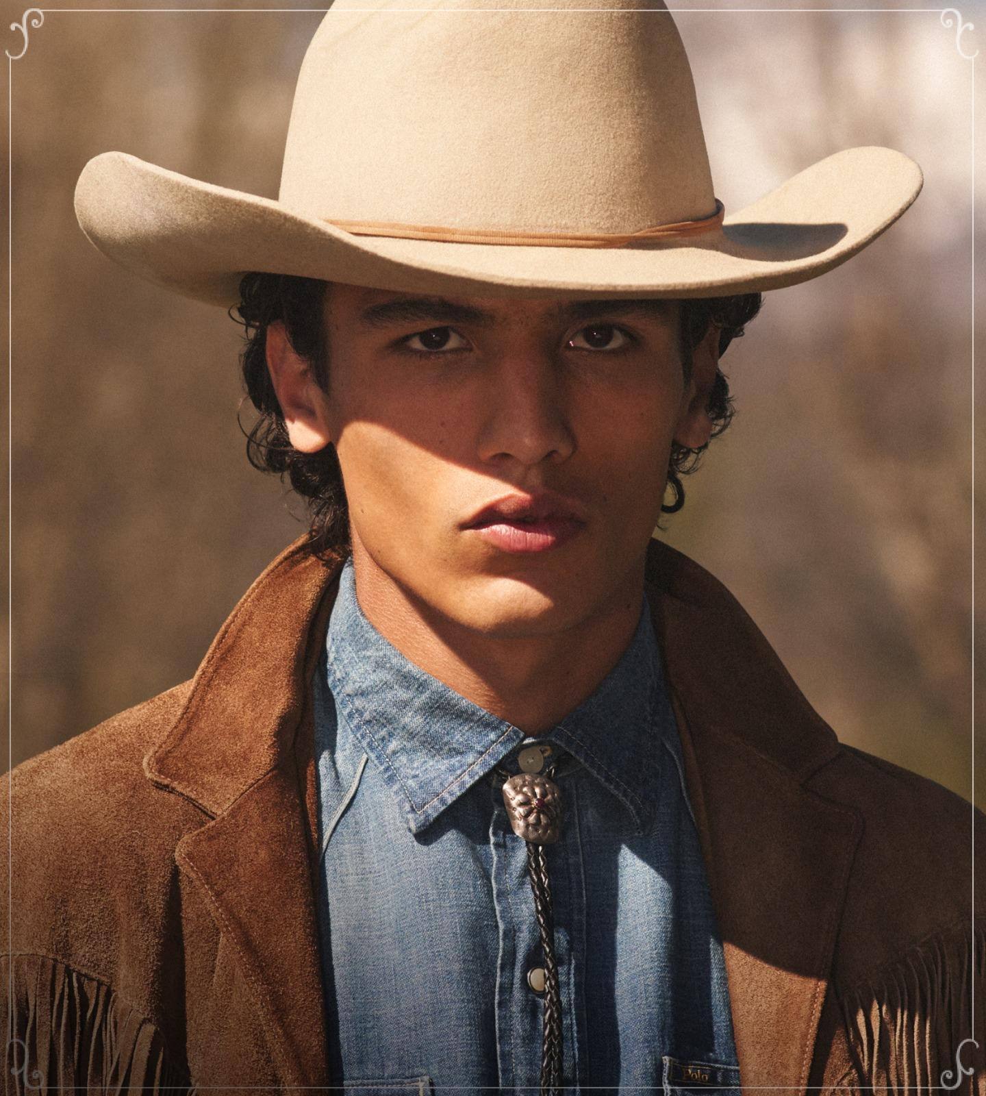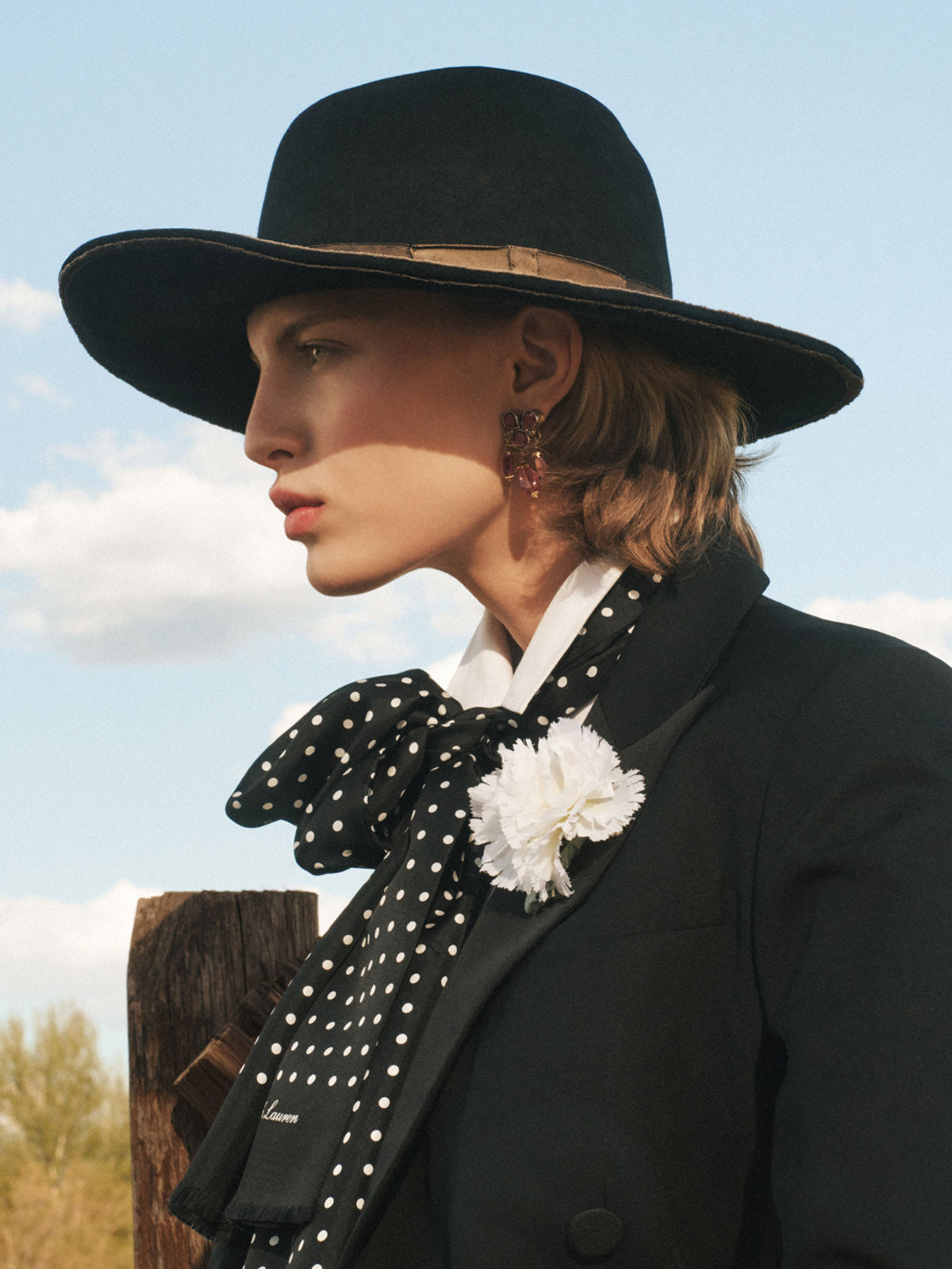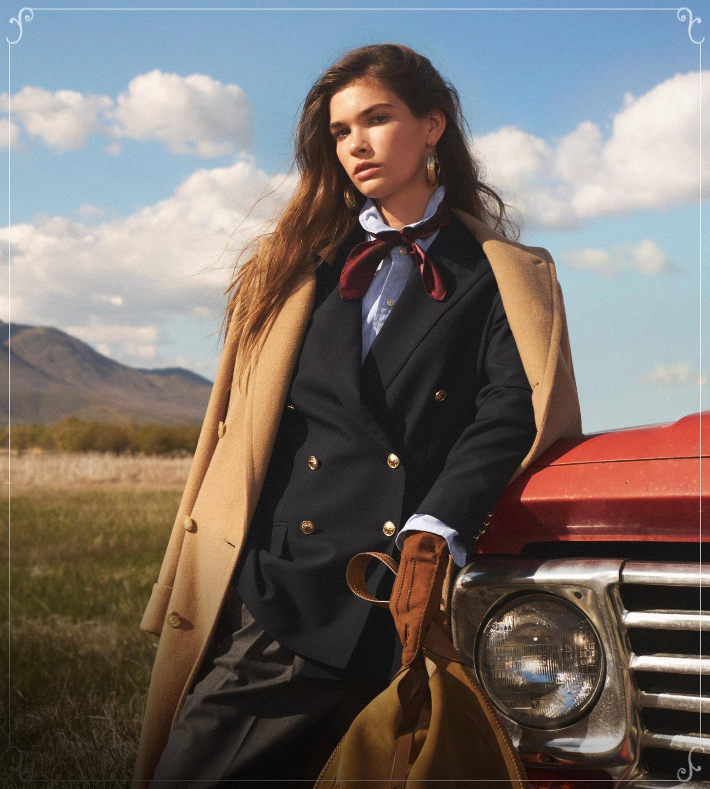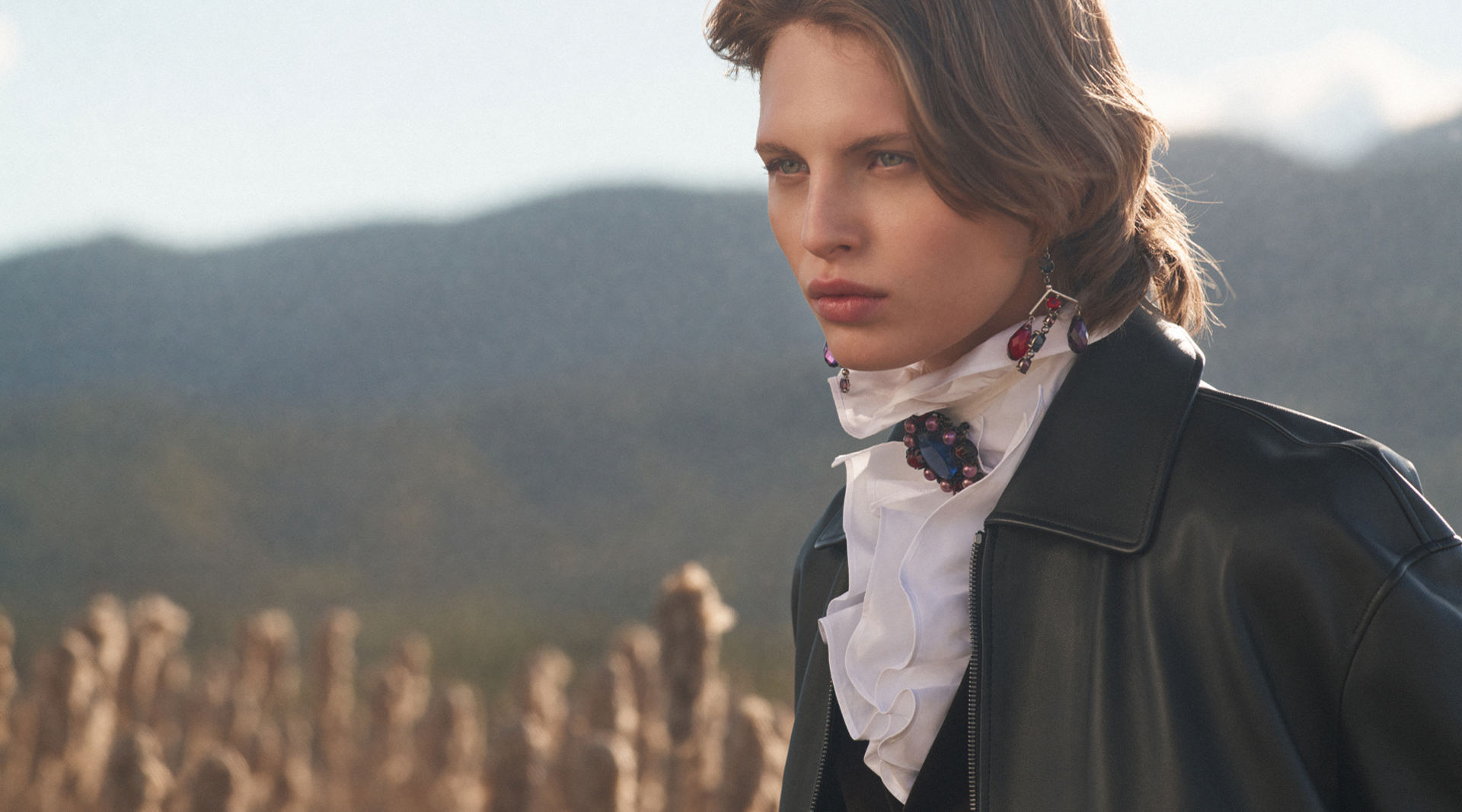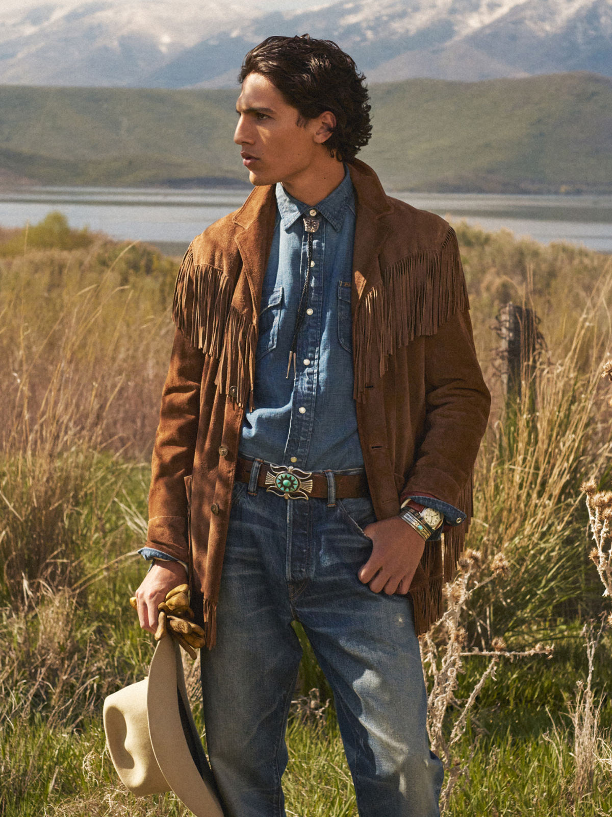 在无边无际的地平线上,崎岖的山峦绵延不绝,马儿在篱栏边悠然吃草,老旧的红色卡车则在无尽的碎石路上隆隆前行。Ralph Lauren 2025 年秋季系列以这幅电影般的画面为灵感源泉,演绎恒久经典的美式奢华格调